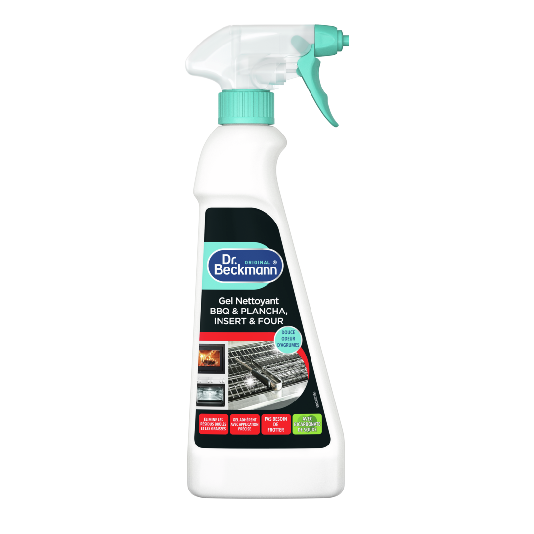 Ce Gel Nettoyant Four, Plancha & Insert au bicarbonate de soude élimine les incrustations tenaces, les taches brûlées et les taches de graisse. La formule gel, qui adhère également aux surfaces verticales, pénètre dans les couches les plus basses des incrustations, même épaisses, et est respectueuse du matériau. Le Gel Nettoyant Four, Plancha & Insert de Dr. Beckmann convient également aux grilles de barbecue, aux poêles et aux vitres de cheminée. Il nettoie de tout reste alimentaire, il est sans vapeurs agressives ou nocives et sent agréablement le pamplemousse.