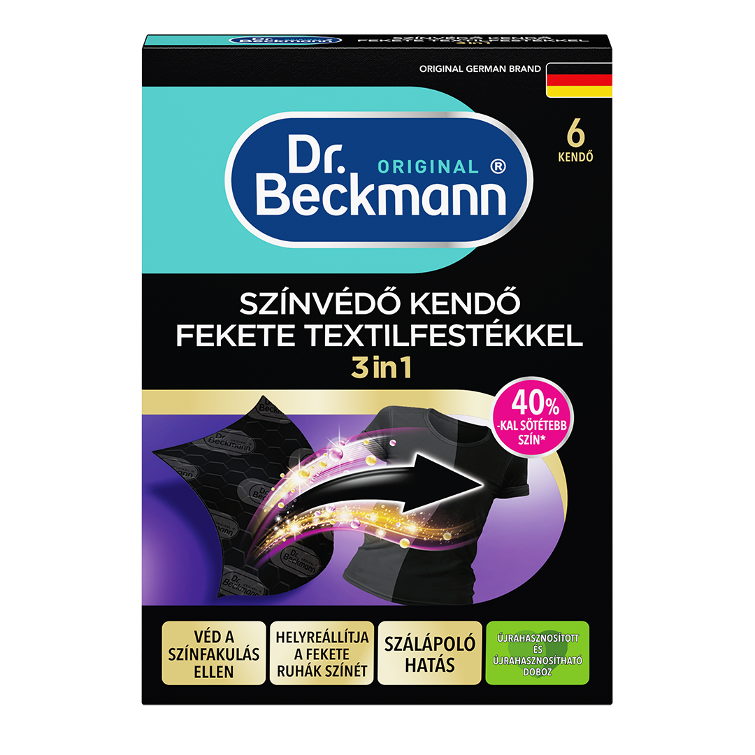Farmer, felső vagy kis fekete ruha – a fekete az örök kedvenc, amely minden alkalomhoz illik. Az idő és a gyakori mosások során a fekete ruhák hajlamosak kifakulni és bolyhosodni, így kopottnak és ápolatlannak tűnnek. A Dr. Beckmann 3 az 1-ben Mélyfekete színmegőrző kendővel kedvenc feketéi mosásról mosásra újszerűen, élénken és simán ragyognak. A kendők a valódi fekete színanyagokkal működő szín- és szálápoló technológiával készültek, így a sötét árnyalatok mélyek és gazdagok maradnak. A formula helyreállítja és védi a fekete ruhadarabokat, akár 40%-kal intenzívebb sötétséget biztosítva.* A szálápoló összetevők kisimítják a már sérült szálakat, és újraélesztik a fekete színek ragyogását, így hosszú távon hozzájárulnak ruhái értékének megőrzéséhez. Könnyen használható, normál mosásnál is működik. Hogy fekete ruhái minden mosás után úgy nézzenek ki, mintha újak lennének.Ideális