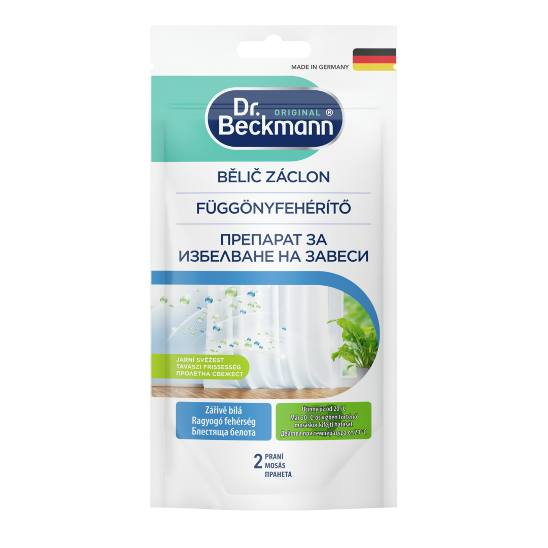 Hasznos a különösen besárgult függönyöket egy éjszakára Folteltávolító só oldatban áztatni, például a Dr. Beckmann Power White Folteltávolítóval. Ezt követően mossa ki a függönyöket általános mosószerrel és a Dr. Beckmann Függöny fehérítővel.