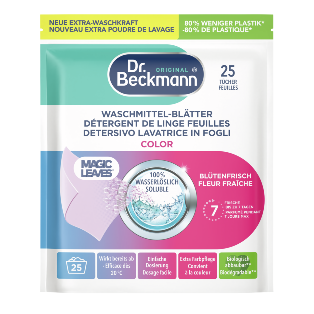 Rispetto ai tradizionali detersivi liquidi per bucato disponibili in flaconi di plastica, Dr. Beckmann riesce a utilizzare l’80% in meno del materiale di imballaggio. Evitare completamente la plastica, purtroppo, non è ancora un’opzione possibile. La plastica viene utilizzata per proteggere i fogli detergenti dall’umidità, poiché sono idrosolubili. Il materiale utilizzato è composto da una pellicola riciclabile, quindi può essere riutilizzato nel ciclo di riciclaggio. Inoltre, lavoriamo costantemente all’ottimizzazione delle confezioni.