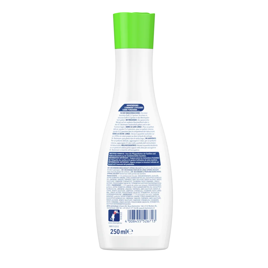 I nuovi Profuma Biancheria Dr. Beckmann avvolgono i tuoi tessuti in una freschezza avvolgente e duratura per una durata fino a 6 settimane. Grazie alla tecnologia delle fragranze incapsulate, gli avvolgenti profumi si diffondono lavaggio dopo lavaggio e vengono rilasciati ogni volta che sono a contatto con i capi, ad es. quando si estraggono dall'armadio o si indossano durante il giorno. I nuovi Profuma Biancheria Dr. Beckmann sono dermatologicamente testati, delicati sui tessuti e adatti anche per capi delicati e tessuti sintetici. I liquidi sono facili da usare ed adatti a cicli di lavaggio freddi e brevi senza lasciare residui.