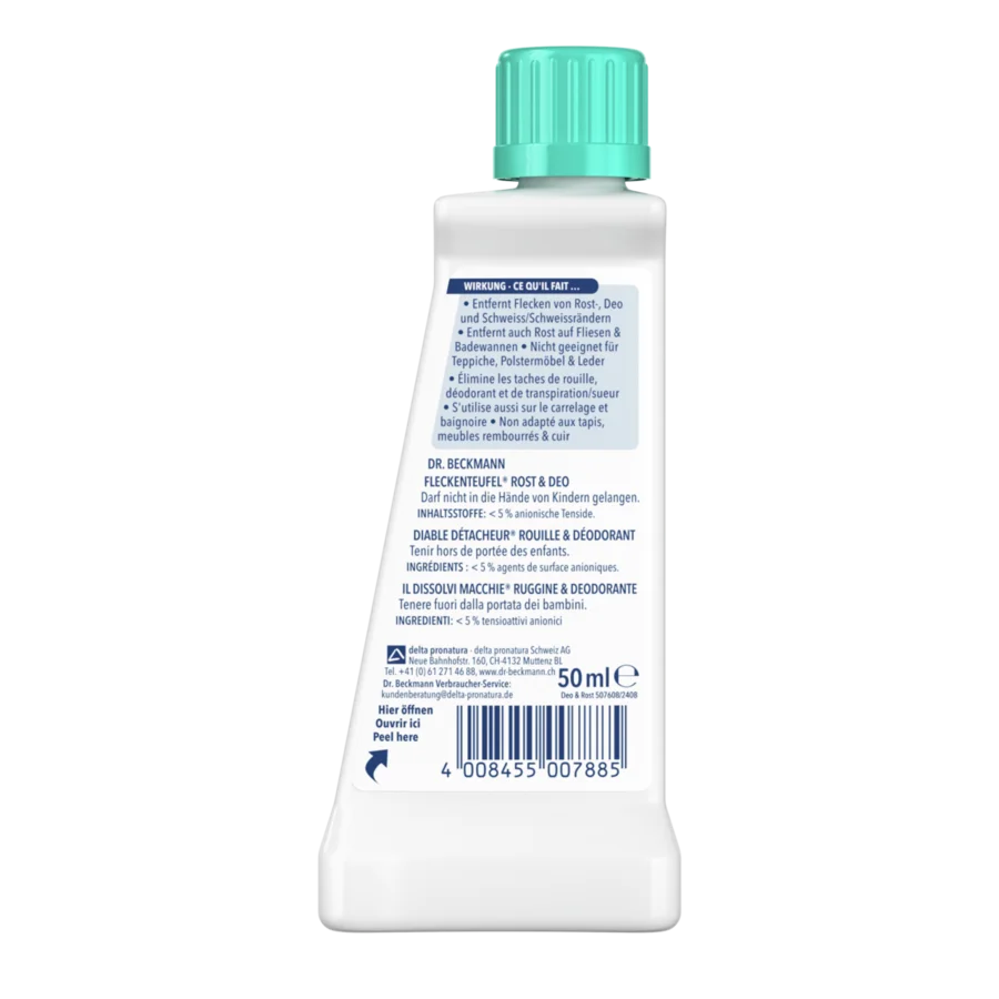 Il Dissolvi Macchie Ruggine & Deodorante di Dr. Beckmann rimuove le macchie che contengono ossido di ferro. Se la macchia è stata causata da altri ossidi metallici, il Dissolvi Macchie Ruggine & Deodorante non è adatto.