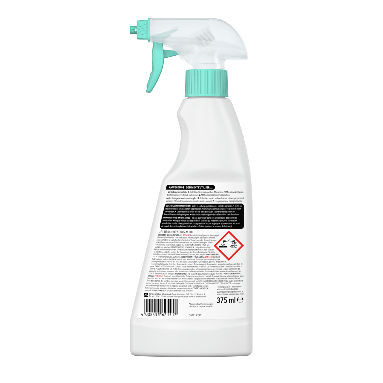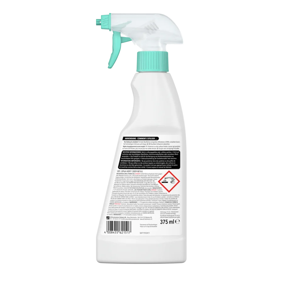 Il nostro detersivo per forni è caratterizzato da un’esclusiva formula in gel e da una testina spray facile da usare. A differenza degli spray tradizionali che rilasciano schiuma, il nostro gel aderisce alle superfici, garantendo una pulizia più precisa ed efficace. Ciò significa che non ci sono vapori o nebbie irritanti tipicamente associati ai prodotti spray. Inoltre, la nostra formula lascia un fresco profumo di pompelmo, che rende la pulizia del forno più piacevole. Il prodotto è adatto anche per la pulizia di griglie, padelle, friggitrici ad aria, teglie da forno, griglie e vetri dei caminetti.