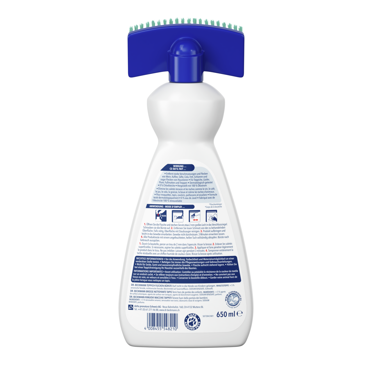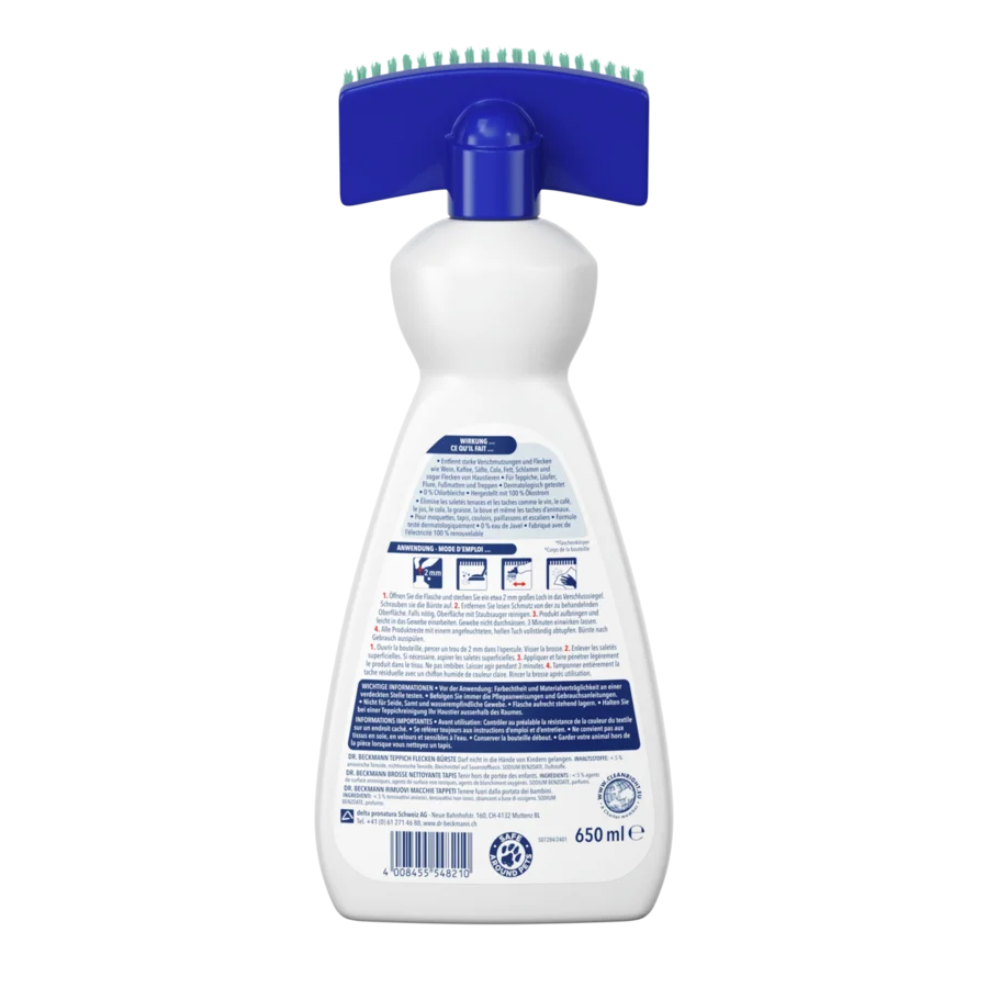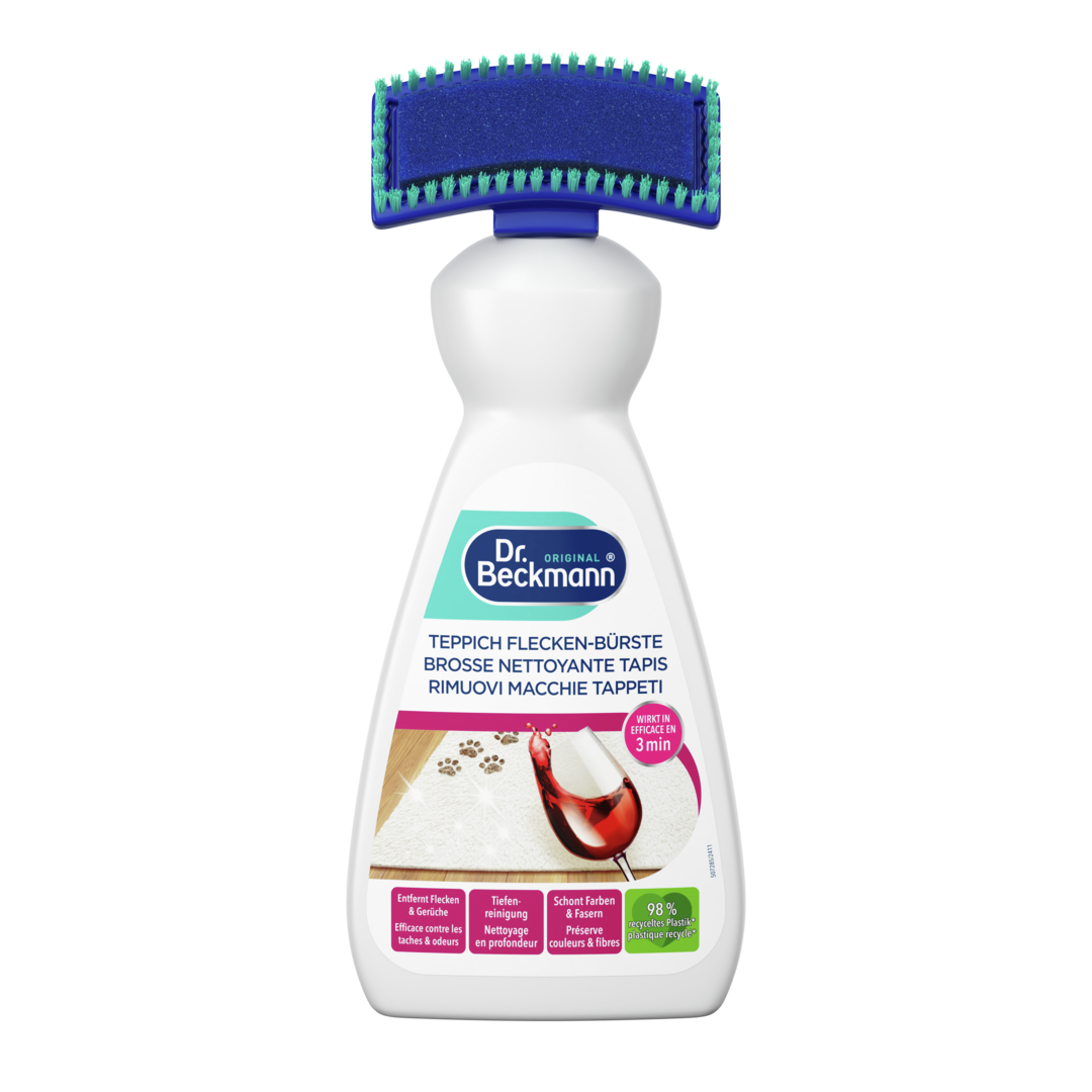 La potente formula detergente a base di ossigeno di Dr. Beckmann Rimuovi Macchie Tappeti elimina le macchie fresche e secche e gli aloni antiestetici causati da vino rosso, caffè, succhi di frutta, cola, tè, grasso, trucco, fango e persino urina di animali domestici. Grazie alla spazzola 2in1 integrata con spugna e setole, il tuo lavoro è più facile che mai, quindi puoi usarlo anche su aree molto trafficate come corridoi, zerbini e scale. Qualunque sia lo sporco, la spazzola penetra in profondità nelle fibre e pulisce a fondo il tuo tappeto, per superfici davvero pulite che sembrano nuove. La nostra formula è priva di candeggina a base di cloro ed è dermatologicamente testata.