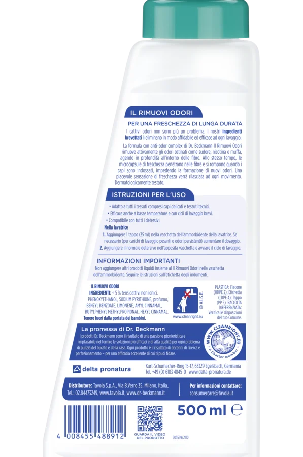 Il Rimuovi Odori di Dr. Beckmann contiene una formula anti-odore che rimuove attivamente gli odori più ostinati agendo in profondità sulle fibre dei tessuti. Le capsule di freschezza aderiscono alle fibre e si scompongono quando i capi vengono indossati, impedendo così la formazione di nuovi odori che possono a loro volta aderire alle fibre.