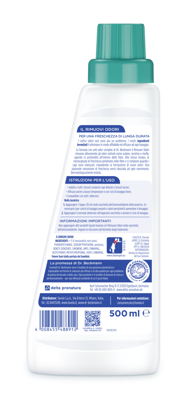 Il Rimuovi Odori di Dr. Beckmann contiene una formula anti-odore che rimuove attivamente gli odori più ostinati agendo in profondità sulle fibre dei tessuti. Le capsule di freschezza aderiscono alle fibre e si scompongono quando i capi vengono indossati, impedendo così la formazione di nuovi odori che possono a loro volta aderire alle fibre.