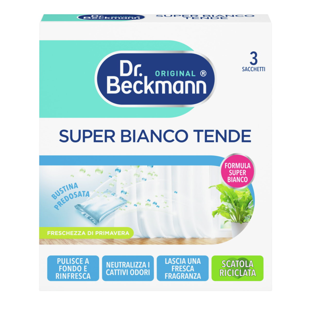 Il Super Bianco Tende di Dr. Beckmann rimuove efficacemente polvere, grasso e macchie ostinate per una pulizia profonda delle fibre. Neutralizza la nicotina e altri odori sgradevoli. Di conseguenza, le tende torneranno a brillare di un bianco brillante. Il prodotto lascia un profumo fresco per una meravigliosa sensazione di freschezza. Dona nuova vita a tende, veli, merletti e pizzi. Il Super bianco tende Dr. Beckmann funziona a partire da una temperatura di 20 °C, con un risparmio energetico. È inoltre privo di candeggina. Le pratiche bustine predosate e facili da usare sono realizzate con fibre di origine naturale. Sono confezionate in una scatola di cartone riciclato e riciclabile.