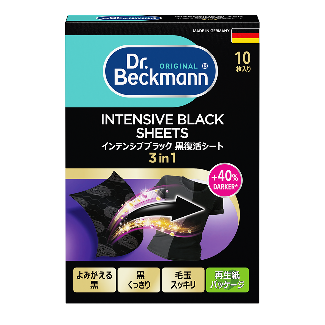 ドクターベックマン・インテンシブブラックシート3in1は、すべての生地タイプに使用できます。綿および綿混紡のテキスタイル、ビスコース、リネンで目に見える効果が確認できます。合成繊維は、色素や酵素に反応しません。