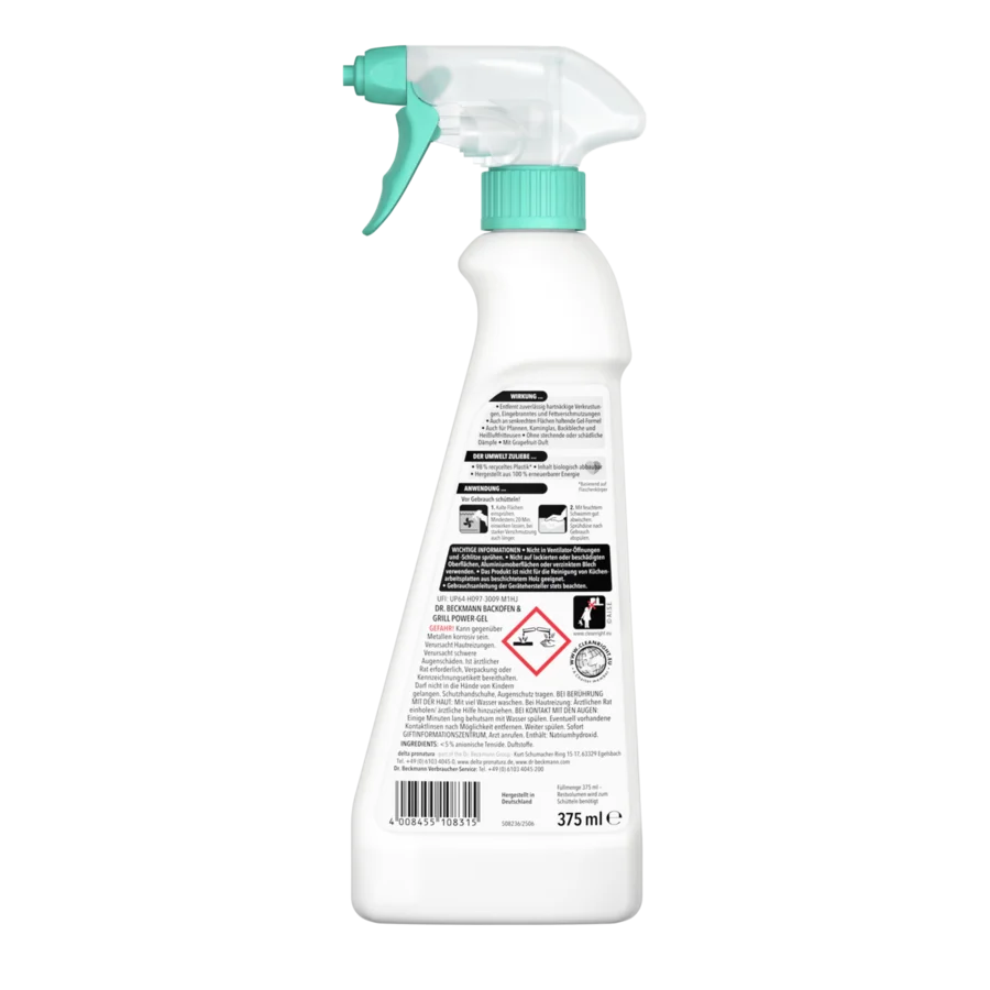 Šis Orkaitės valiklis su valgomąja soda pašalina įsisenėjusias apnašas, pridegusias dėmes ir riebalus. Gelio formulė, kuri prilimpa net prie vertikalių paviršių, prasiskverbia į giliausius net storų apnašų sluoksnius ir tausoja medžiagą. „Dr. Beckmann“ Orkaitės valiklis taip pat tinka kepsninių grotelėms, keptuvėms ir židinių stiklams. Jis saugus naudoti virtuvėje, nesukelia agresyvių ar kenksmingų garų ir maloniai kvepia greipfrutais.