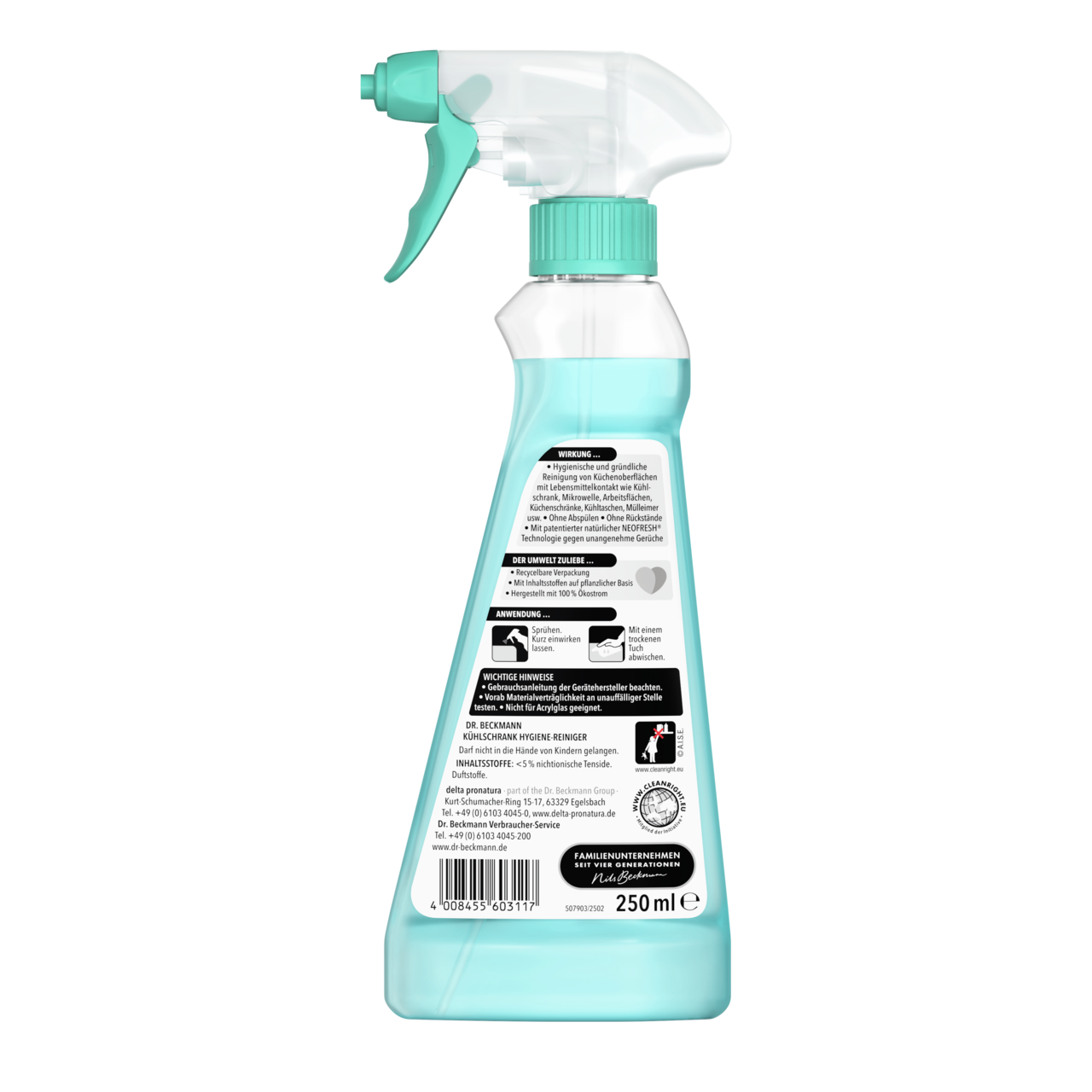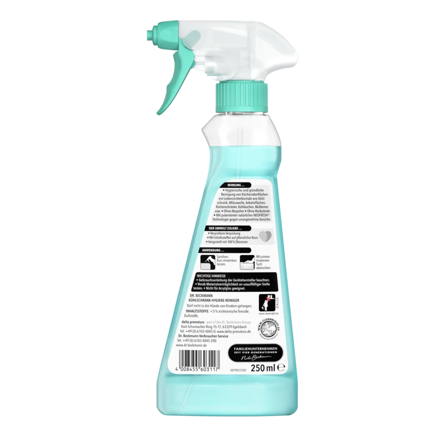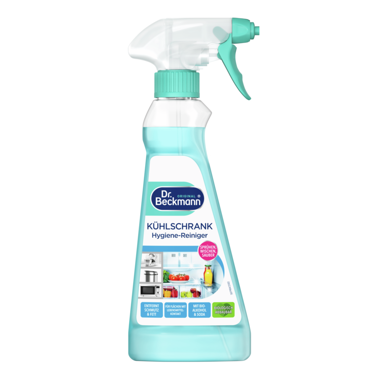 Ten, kur laikomas ar ruošiamas maistas, higieniška švara yra būtina. Reguliarus šaldytuvų, mikrobangų krosnelių, darbastalio paviršių ir kt. valymas yra itin svarbus. „Dr. Beckmann“ Higieninis šaldytuvo valiklis su organiniu alkoholiu greitai užtikrina higienišką ir kruopščią švarą šaldytuve bei aplink jį, o soda, be kita ko, padeda pašalinti riebalus. Dabar – su dar geresniu kvapu. Formulė, kurios nereikia nuskalauti, užtikrina, kad neliktų jokių likučių, todėl priemonę saugu naudoti ant bet kokio paviršiaus. Tiesiog užpurkškite, nuvalykite ir mėgaukitės spindinčia virtuve kiekvieną kartą.
