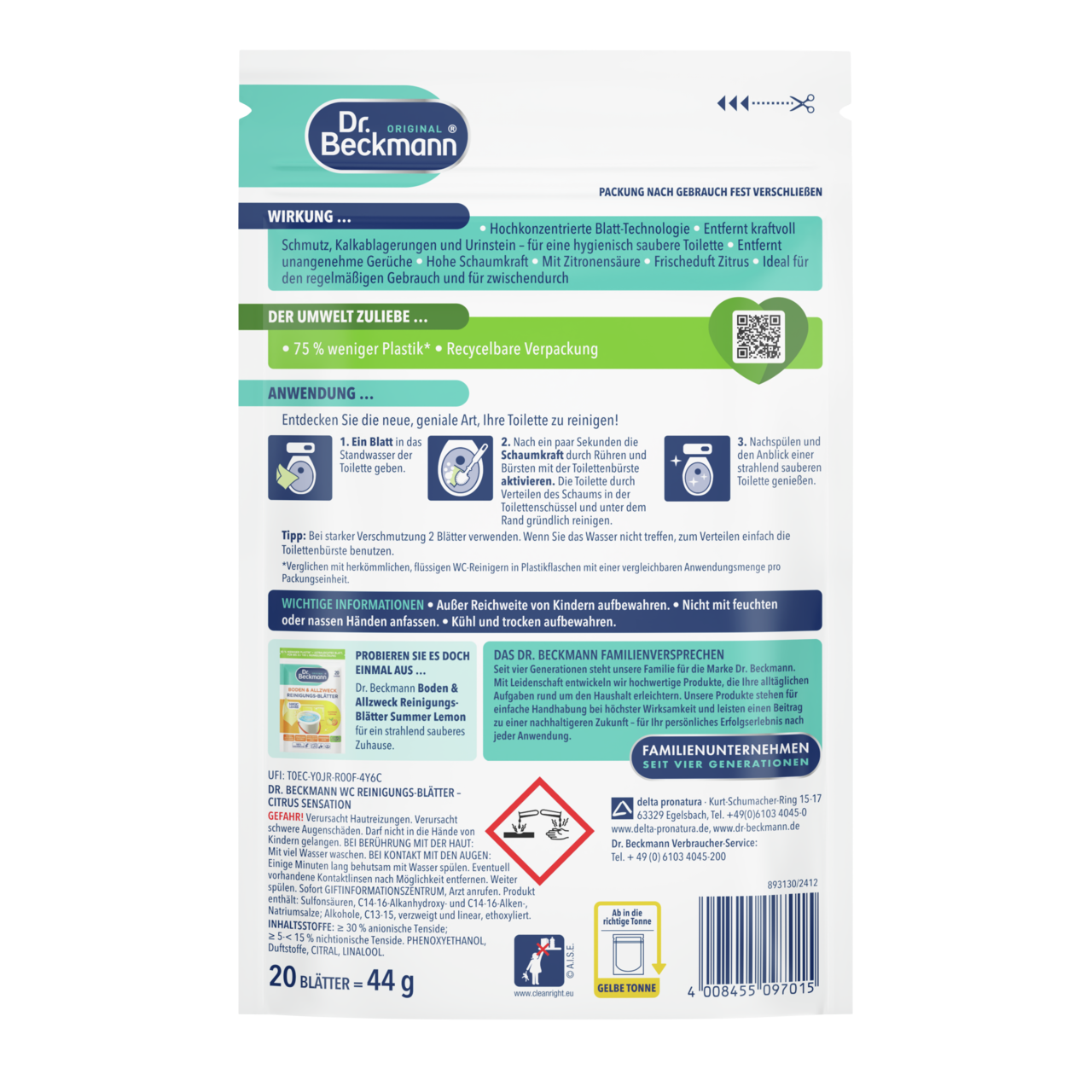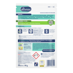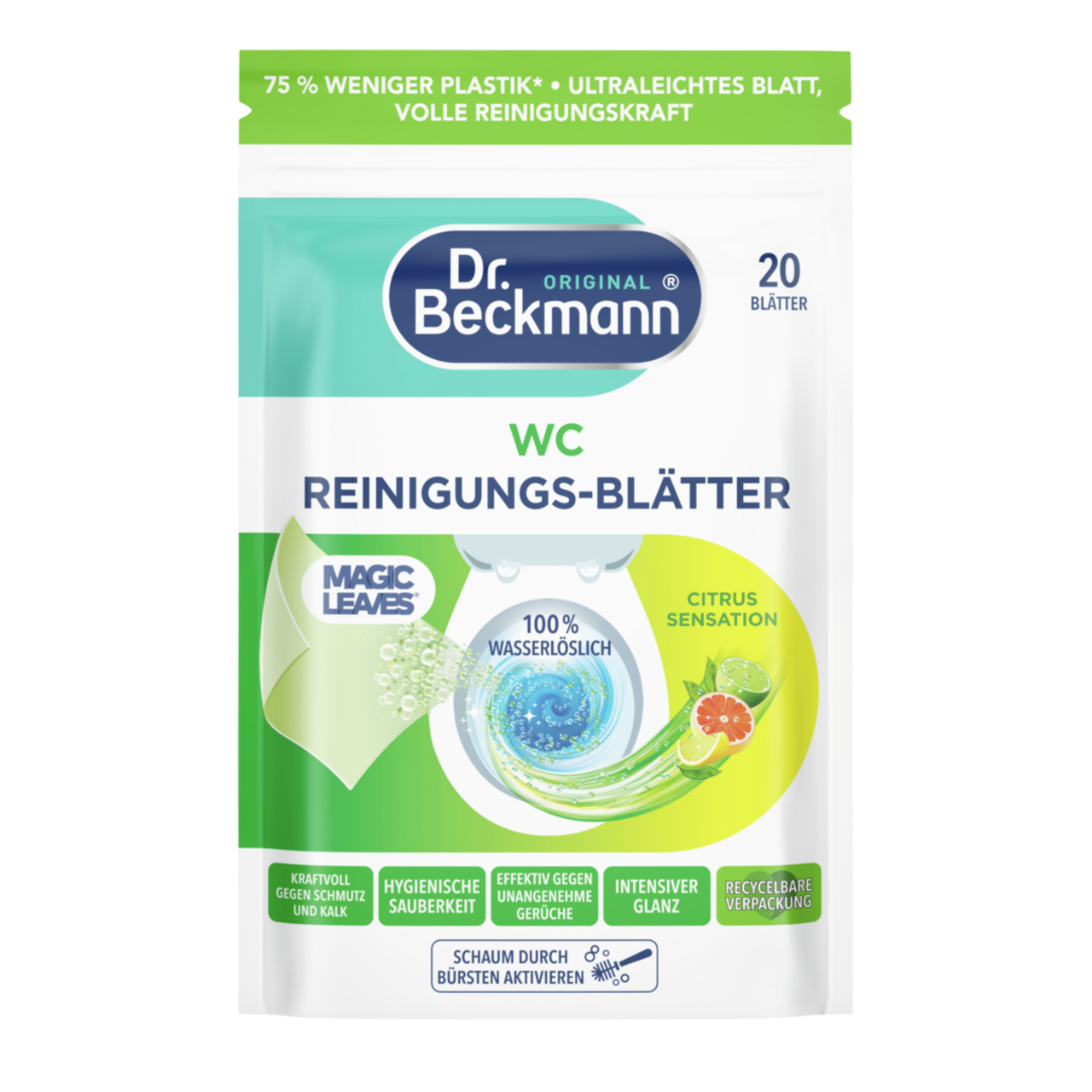Palyginti su įprastais plastikinėse pakuotėse parduodamais tualeto valikliais (kai produkto kiekis vienoje pakuotėje yra panašus), „Dr. Beckmann“ tualeto valiklio lapeliams sunaudojama 83 % mažiau pakavimo medžiagų. Deja, kol kas neįmanoma visiškai išvengti plastiko, nes gaminys yra tirpus vandenyje ir jį reikia maksimaliai apsaugoti nuo išorinės drėgmės. Todėl svarbu naudoti vandeniui ir orui nepralaidžias pakartotinai uždaromas pakuotes, kad produktą būtų galima kuo ilgiau naudoti ir jis būtų veiksmingas. Tokio tipo gaminiams paprastai geriausiai tinka plastikinis maišelis – tai išbandytas ir patikrintas pakavimo sprendimas ploviklių ir valymo priemonių sektoriuje. Pastatomi maišeliai gali būti perdirbami. Be to, pakuotes nuolat tobuliname.