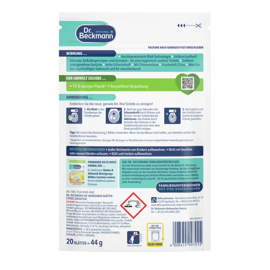 „Dr. Beckmann“ tualeto valymo lapeliai – revoliucinis būdas prižiūrėti tualetą: ypač lengvi lapeliai visiškai ištirpsta vandenyje ir veiksmingai šalina nešvarumus, kalkių nuosėdas bei šlapimo akmenį. Tai padaryti paprasta: Tereikia įmesti, nušveisti ir nuplauti. Lapeliai taip pat panaikina nemalonius kvapus ir suteikia malonų citrinų aromatą. Dėl kompaktiškos formos valymo lapelius patogu nešiotis ir laikyti, o jų pakuotėje sunaudojama 75 % mažiau plastiko*. Išbandykite mūsų naujuosius tualeto valymo lapelius nepriekaištingai ir higieniškai švarai palaikyti!