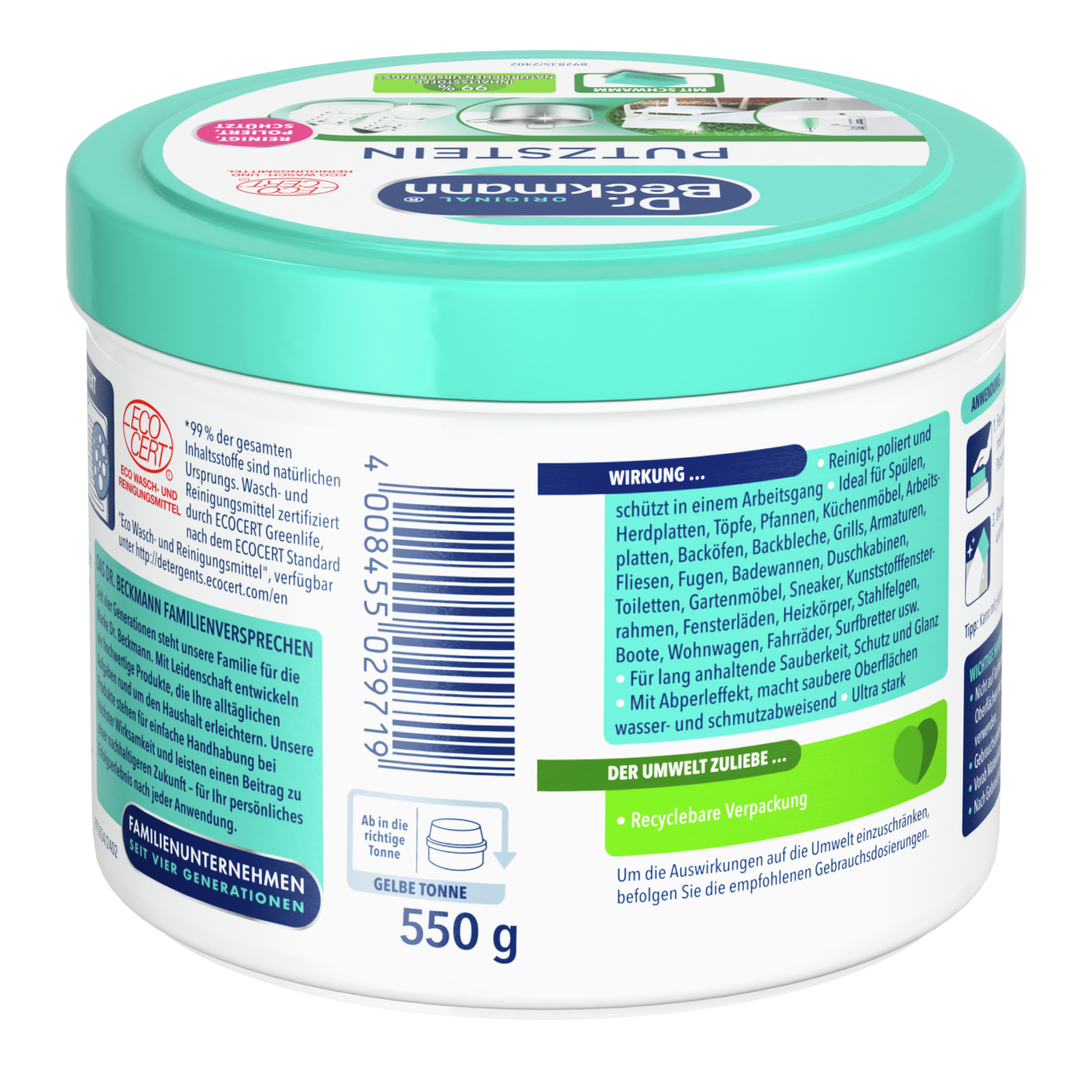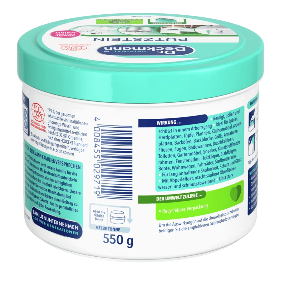 Paviršių valymo priemonė yra galinga, bet saugi alternatyva įprastiems, agresyviems valikliams. Dėl gausaus pritaikomumo valiklį naudosite visur: nuo stalviršių iki plytelių ar lauko baldų. Sudėtyje – 99 proc. natūralių medžiagų ir smulkios poliravimo dalelės. Kartu su pridedama kempine nuvalo net sunkiausiai pašalinamus nešvarumus. Dėl sudėties ir kempinės poveikio paviršiai ne tik krupščiai nuvalomi, bet ir įgauna ilgalaikį blizgesį bei apsaugą.