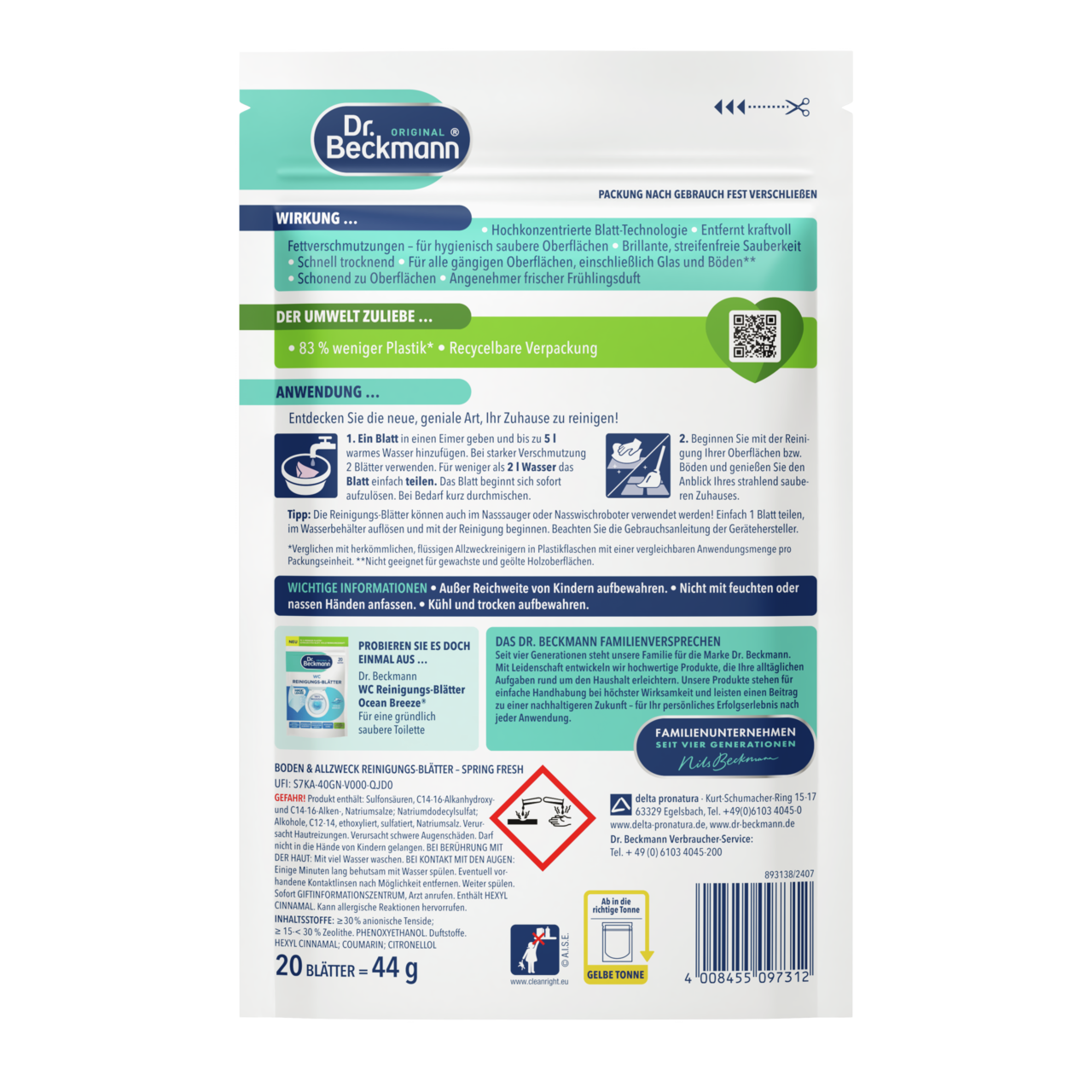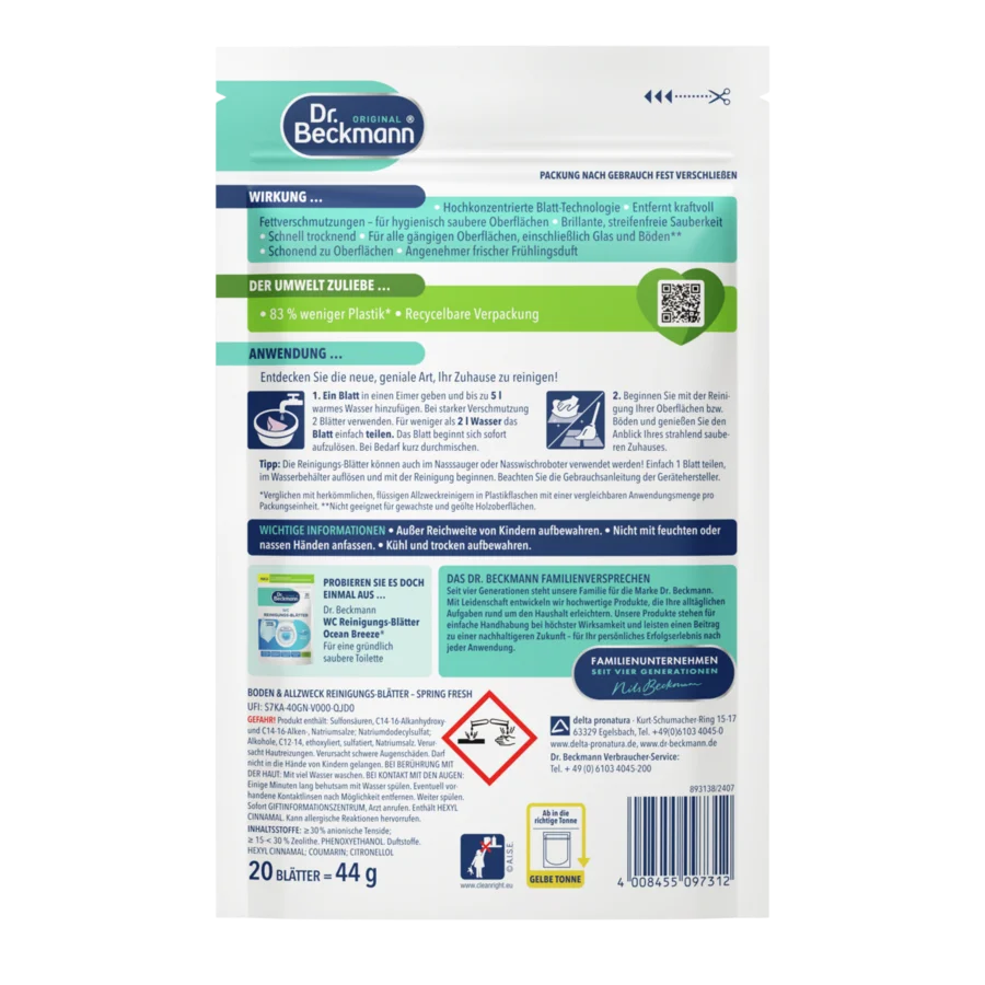 „Dr. Beckmann“ universalūs valymo lapeliai sukelia revoliuciją namų ruošoje: Itin lengvi lapeliai visiškai ištirpsta ir galingai kovoja su purvu bei riebalais. Tai padaryti paprasta: Tiesiog įmeskite ir plaukite! Lapeliai tinka visiems įprastiems paviršiams bei grindims** ir palieka malonų gėlių kvapą. Dėl kompaktiško formato universalius valymo lapelius lengva nešiotis, laikyti, o jų pakuotėje sunaudojama 83 proc. mažiau plastiko*. Atraskite mūsų naujus universalius valymo lapelius spindintiems ir higieniškai švariems namams!