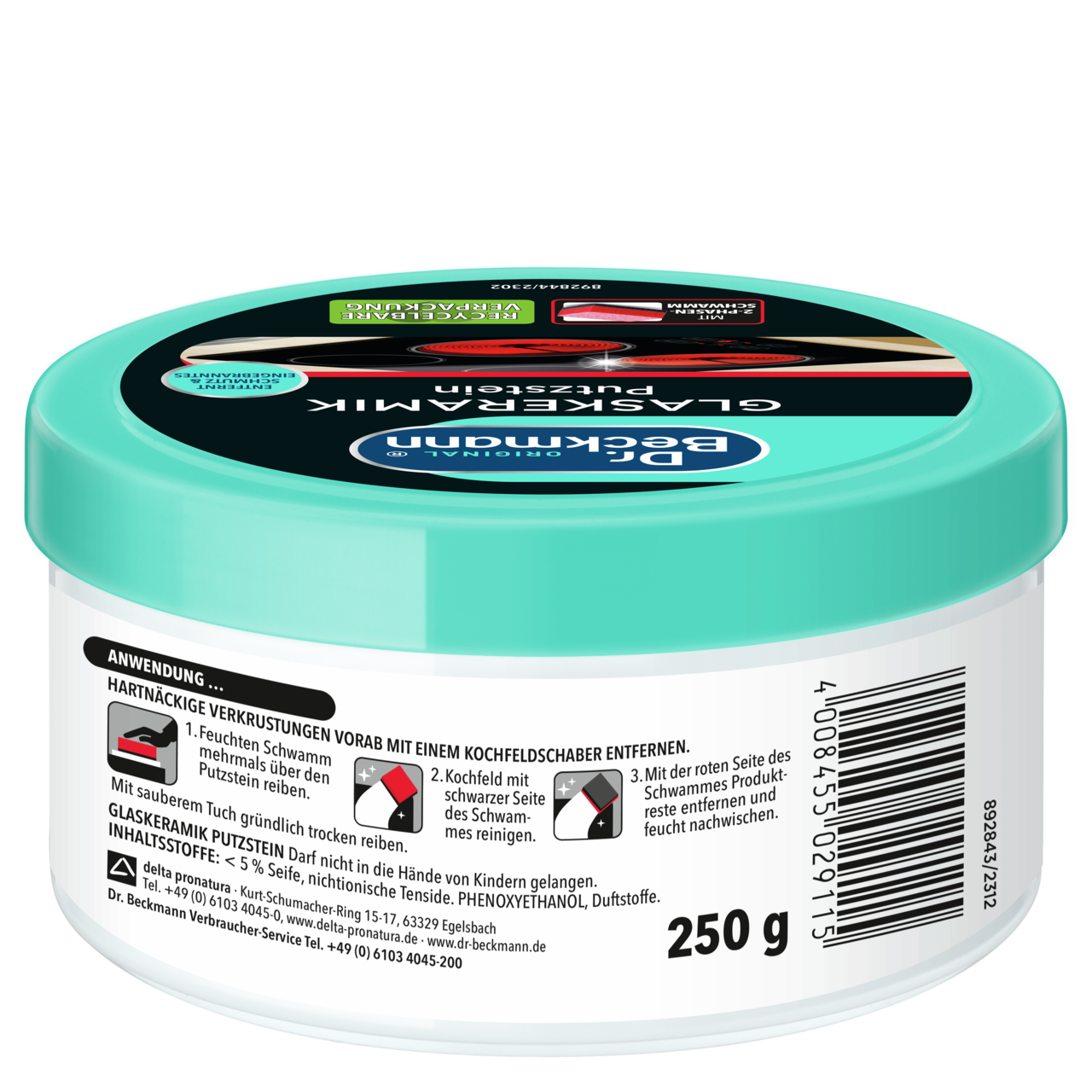 Galinga formulė su aktyvuota anglimi kartu su specialia „Dr. Beckmann“ Stiklo keramikos valymo priemonė kempine pašalina net įsisenėjusį purvą, apnašas ir pridegusius likučius. Natūralios poliravimo granulės, pagamintos iš abrikosų kauliukų, veiksmingai kovoja su purvu, tačiau tausoja paviršių ir aplinką. Stiklo keramikos kaitlentė įgauna šilkinį spindesį. Vandens atstūmimo efektas palengvina būsimą valymą.