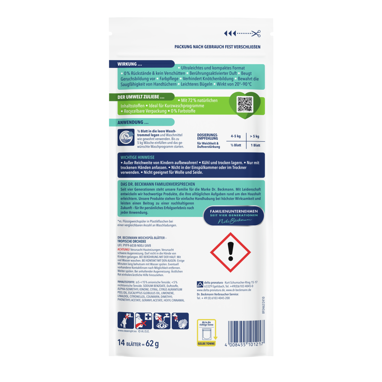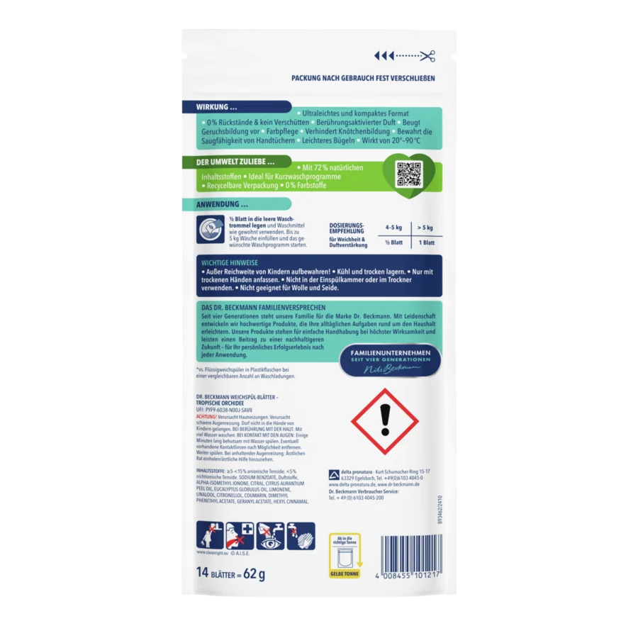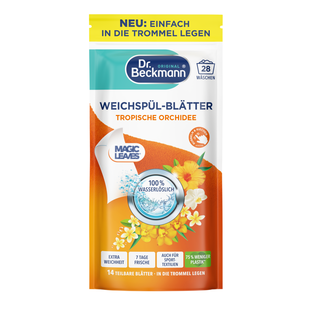 Pristatome inovatyvius „Dr. Beckmann“ audinių minkštiklio lapelius, sukurtus pakeisti jūsų skalbimo patirtį. Šie itin lengvi ir 100 proc. tirpūs lapeliai yra ne tik lengvai nešiojami bei laikomi, bet ir neįtikėtinai paprastai naudojami. Tiesiog įmeskite vieną lapelį į skalbimo būgną ir mėgaukitės ilgalaike gaiva iki 7 dienų bei ypatingu minkštumu.