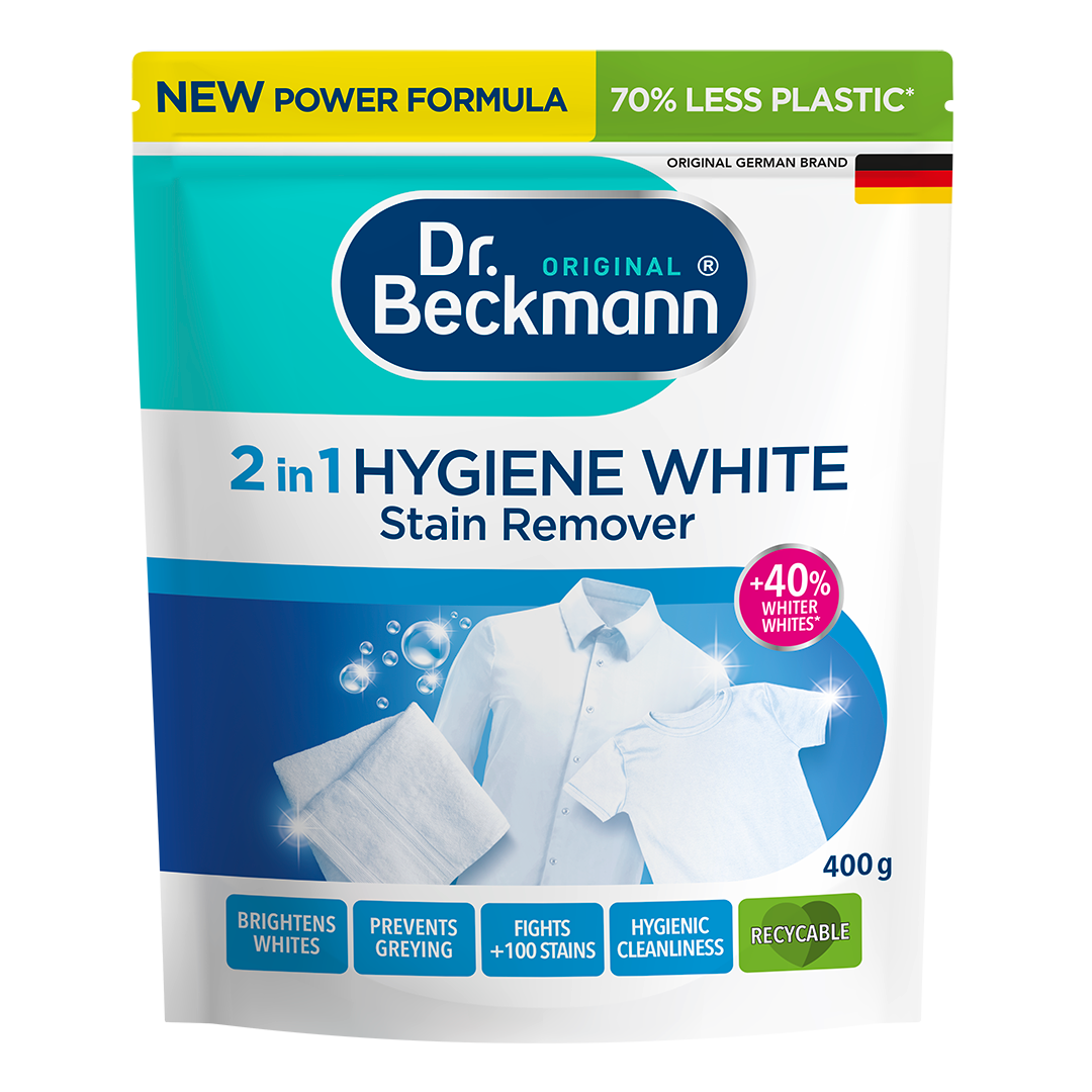 Vandenyje tirpūs produktai turi būti supakuoti į vandeniui ir orui nepralaidžią bei uždaromą pakuotę, kad būtų išsaugota jų kokybė, galiojimo laikas ir veiksmingumas. Tam ypač tinka plastikinis pastatomas maišelis, kuris jau yra išbandytas ir pasiteisinęs skalbiklių ir buitinių valymo priemonių pakuotėms. Palyginti su įprastais skalbimo stiprikliais plastikinėse pakuotėse (skirtais panašiam skalbinių kiekiui), dėmių valikliui „Dr. Beckmann 2 in 1 Higieninis baliklis“ dėmių valikliui reikia 70 % mažiau pakavimo medžiagų. Jau kuriame iš ekologiškesnių medžiagų pagamintas pakuotes, tačiau, deja, šiuo metu negalime apsieiti be plastiko.