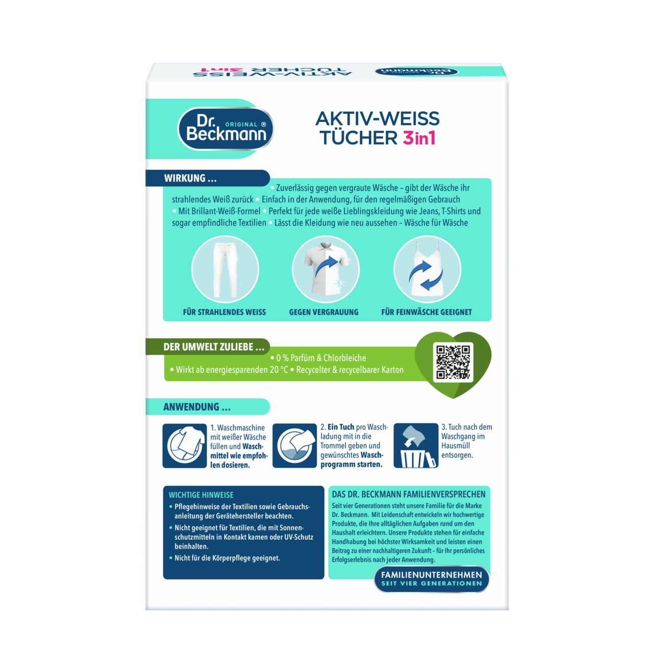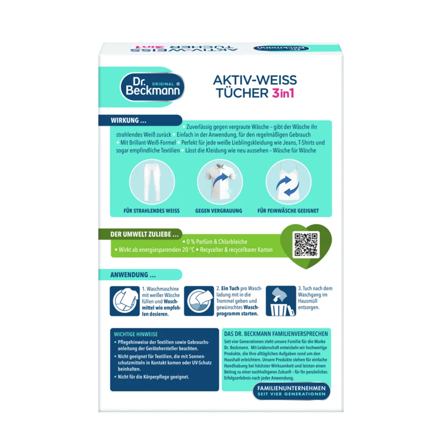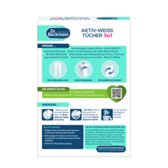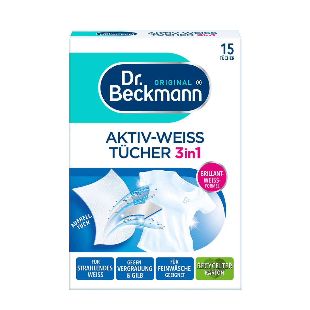 Dėl daugybės skalbimo ciklų ir skalbiklio tirpale esančių likučių balti tekstilės gaminiai ilgainiui papilkėja. Ilgai laikant tekstilės gaminius, jie gali įgauti negražų gelsvą atspalvį. „Dr. Beckmann“ Aktyvūs balinimo lapeliai su baltumo stiprinimo formule atgaivina baltą spalvą, apsaugo nuo pilkėjimo ir švelniai veikia net jautrius audinius. Lapelius paprasta naudoti įprasto skalbimo metu. Puikiai tinka visiems jūsų mėgstamiems baltiems drabužiams, pavyzdžiui, džinsams, marškinėliams ir jautriems audiniams. Mūsų Aktyvūs balinimo lapeliai veikia taupant energiją nuo 20 °C. Jų sudėtyje nėra kvapiųjų medžiagų ir chloro baliklių. Jie pateikiami perdirbtoje ir perdirbamoje dėžutėje.
