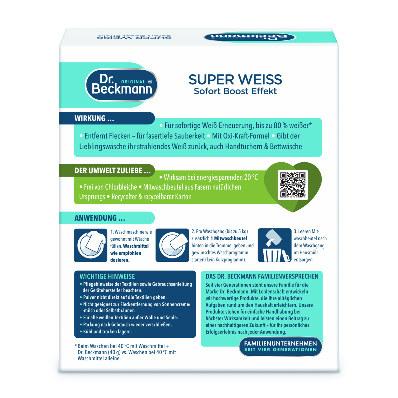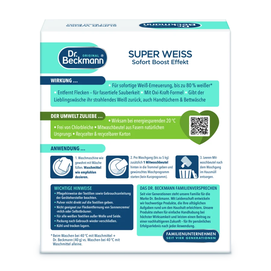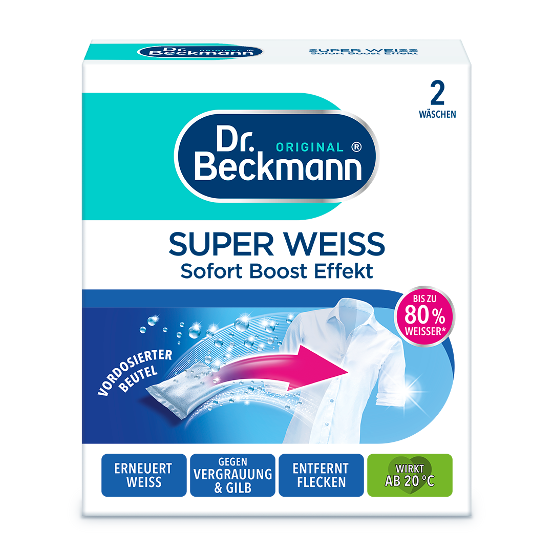 Dėl daugybės skalbimo ciklų ir skalbiklio tirpale esančių likučių balti tekstilės gaminiai ilgainiui papilkėja. Ilgai laikant tekstilės gaminius, jie gali įgauti negražų gelsvą atspalvį. Dr. Beckmann Skalbinių baliklis paketėliai akimirksniu atgaivina baltumą. Su „Oxi white“ technologija. Mūsų gaminys suteikia naują gyvenimą jūsų mėgstamiems baltiems drabužiams, taip pat uniformoms, rankšluosčiams ir patalynei. Tuo pačiu metu kovoja su dėmėmis, kad jūsų tekstilės gaminių pluoštas būtų giliai išvalytas. Dr. Beckmann Skalbinių baliklis paketėliai veikia taupant energiją nuo 20 °C. Praktiški dozuoti ir lengvai naudojami paketėliai pagaminti iš natūralios kilmės pluoštų. Jie pateikiami perdirbtoje ir perdirbamoje dėžutėje.
