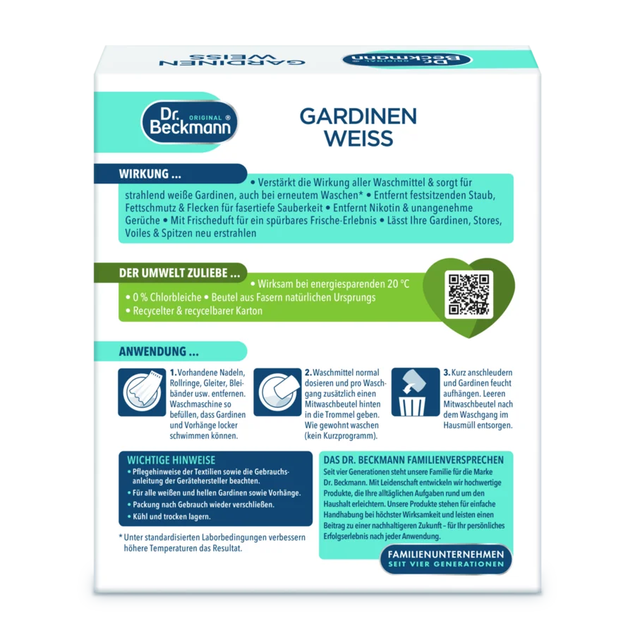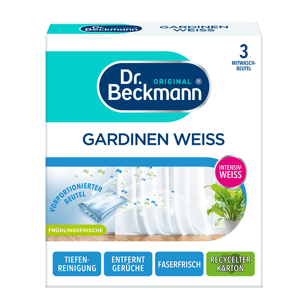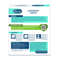 „Dr. Beckmann“ Užuolaidų balinimo priemonė patikimai pašalina įsisenėjusias dulkes, riebalus ir dėmes, užtikrindamas giluminį pluošto valymą. Jis neutralizuoja nikotino ir kitus nemalonius kvapus. Rezultatas – užuolaidos vėl švytės spindinčiu baltumu. Mūsų produktas palieka gaivų aromatą, sukuriantį nuostabų gryno oro pojūtį. Suteikia naują gyvybę jūsų tinklinėms užuolaidoms, tiuliui, vualiams ir nėriniams. „Dr. Beckmann“ Užuolaidų balinimo priemonė veikia taupant energiją nuo 20 °C. Jo sudėtyje nėra chloro baliklių. Praktiški dozuoti ir lengvai naudojami paketėliai pagaminti iš natūralios kilmės pluoštų. Jie pateikiami perdirbtoje ir perdirbamoje dėžutėje.