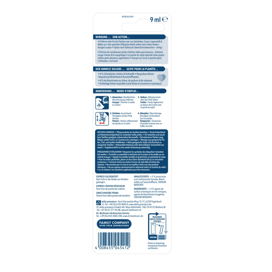 „Dr. Beckmann“ Dėmių pieštukas gali būti paprastas sprendimas visoms dėmėms, atsirandančioms kelyje. Šviežios dėmės lengvai pašalinamos dėl paviršinio aktyvumo medžiagų ir aktyviojo deguonies derinio. Valomasis rašiklio galiukas leidžia tiksliai apdoroti dėmę, o jį nuplovus, rašiklį galima vėl naudoti kitai dėmei nepaliekant jokių likučių.