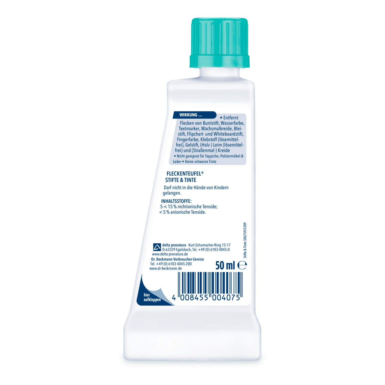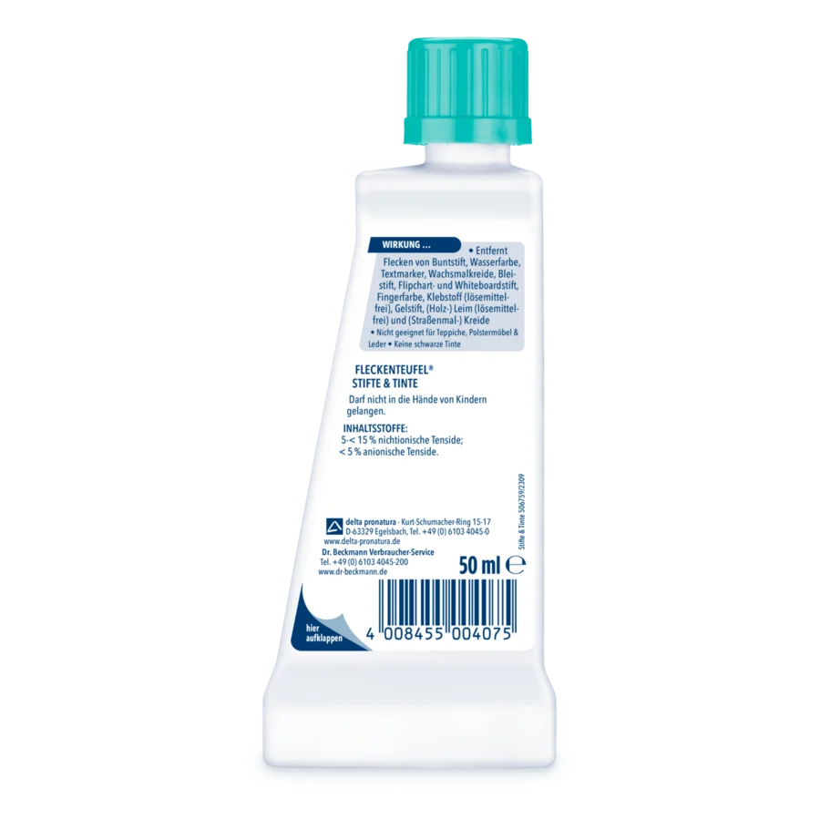 Specialiai pritaikyta „Dr. Beckmann“ Dėmių valiklis, rašikliai ir rašalas formulė atsižvelgia į specifines tušinukų, kitų rašiklių ar akvarelės paliktas žymes. Skystyje esančios spalvos dalelių šalinimo priemonės pagalba pigmentai atskiriami ir pašalinami iš audinio.