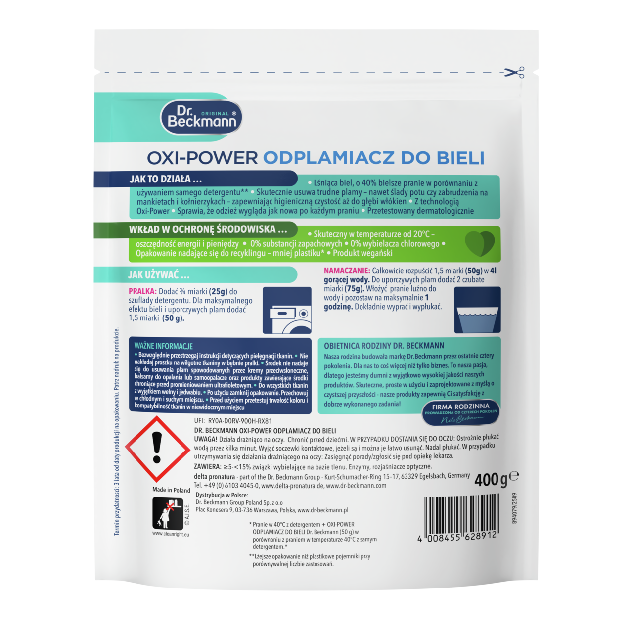 Zwłaszcza w przypadku produktów rozpuszczalnych w wodzie, aby zachować ich jakość, termin przydatności do użycia i skuteczność, niezbędne jest stosowanie hermetycznych, wodoszczelnych i zamykanych opakowań. Szczególnie dobrze działa w tym przypadku torebka z tworzywa sztucznego, która sprawdza się w przypadku detergentów i domowych środków czyszczących. W porównaniu do konwencjonalnych wzmacniaczy prania w plastikowych pojemnikach (o porównywalnej liczbie prań na jednostkę opakowania), środek do usuwania plam do białych tkanin Dr. Beckmann Power pozwala na osiągnięcie efektu przy użyciu o 70% mniejszej ilości materiału opakowaniowego. Już teraz pracujemy nad opcjami opakowań wykonanych z materiałów bardziej przyjaznych dla środowiska, lecz niestety w tej chwili nie możemy obejść się bez plastiku.