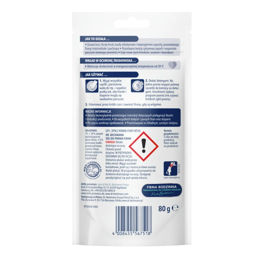 Dr. Beckmann Sól do prania firan - 2 prania skutecznie usuwa uporczywy kurz, tłuste zabrudzenia, nikotynę i nieprzyjemne zapachy. Głęboko czyści włókna zasłon, sprawia że są białe i posiadają przyjemny zapach, zapewniając przyjemne uczucie świeżości w powietrzu. Środek działa już od energooszczędnej temperatury 20°C.