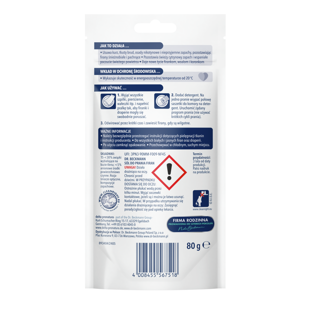 Dr. Beckmann Sól do prania firan - 2 prania skutecznie usuwa uporczywy kurz, tłuste zabrudzenia, nikotynę i nieprzyjemne zapachy. Głęboko czyści włókna zasłon, sprawia że są białe i posiadają przyjemny zapach, zapewniając przyjemne uczucie świeżości w powietrzu. Środek działa już od energooszczędnej temperatury 20°C.