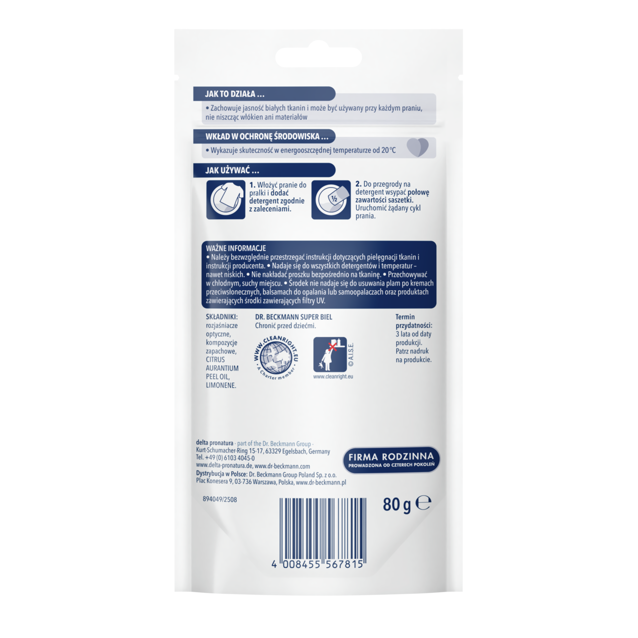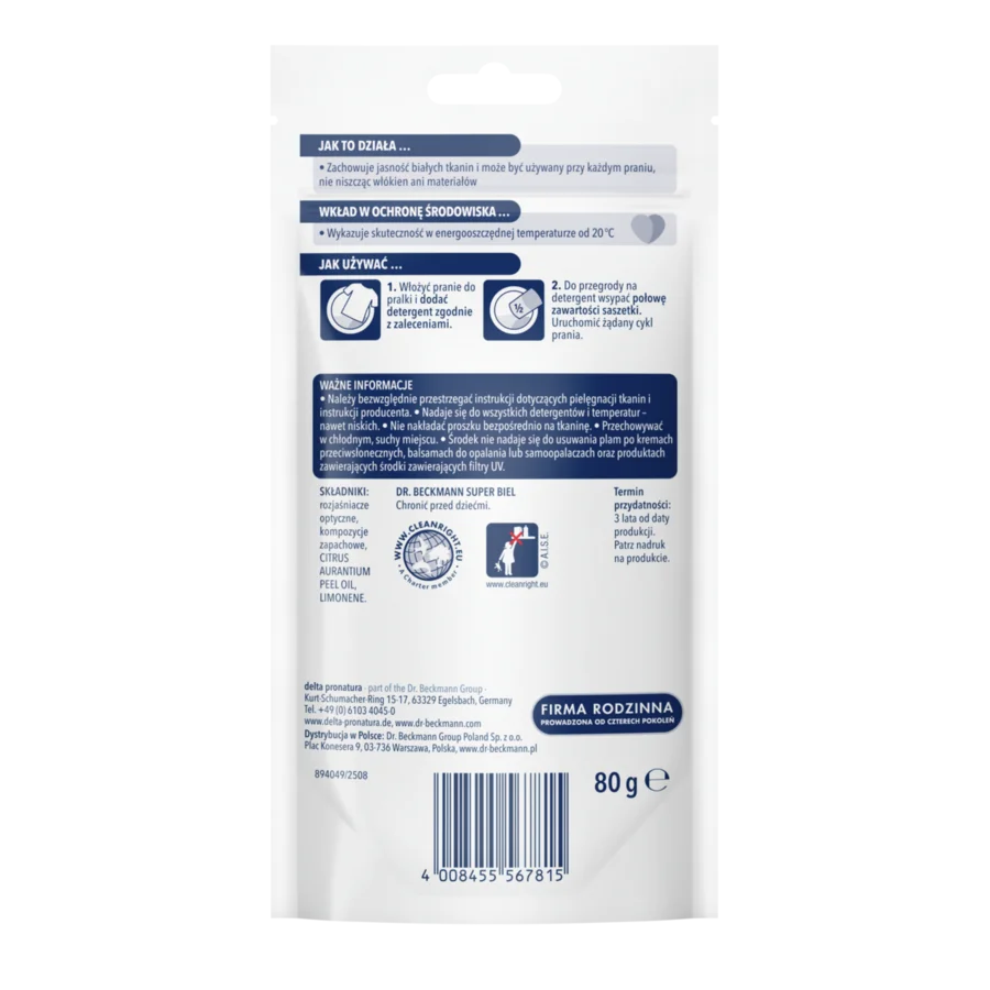 Proszek Dr. Beckmann Super biel pozwala zachować blask białych tkanin, nie niszcząc włókien ani materiałów. Doskonale nadaje się do stosowania przy każdym praniu, pozwalając cieszyć się świeżą bielą. Nadaje się do wszystkich tkanin, cykli i temperatur, nawet tych niskich, jak 20°C.