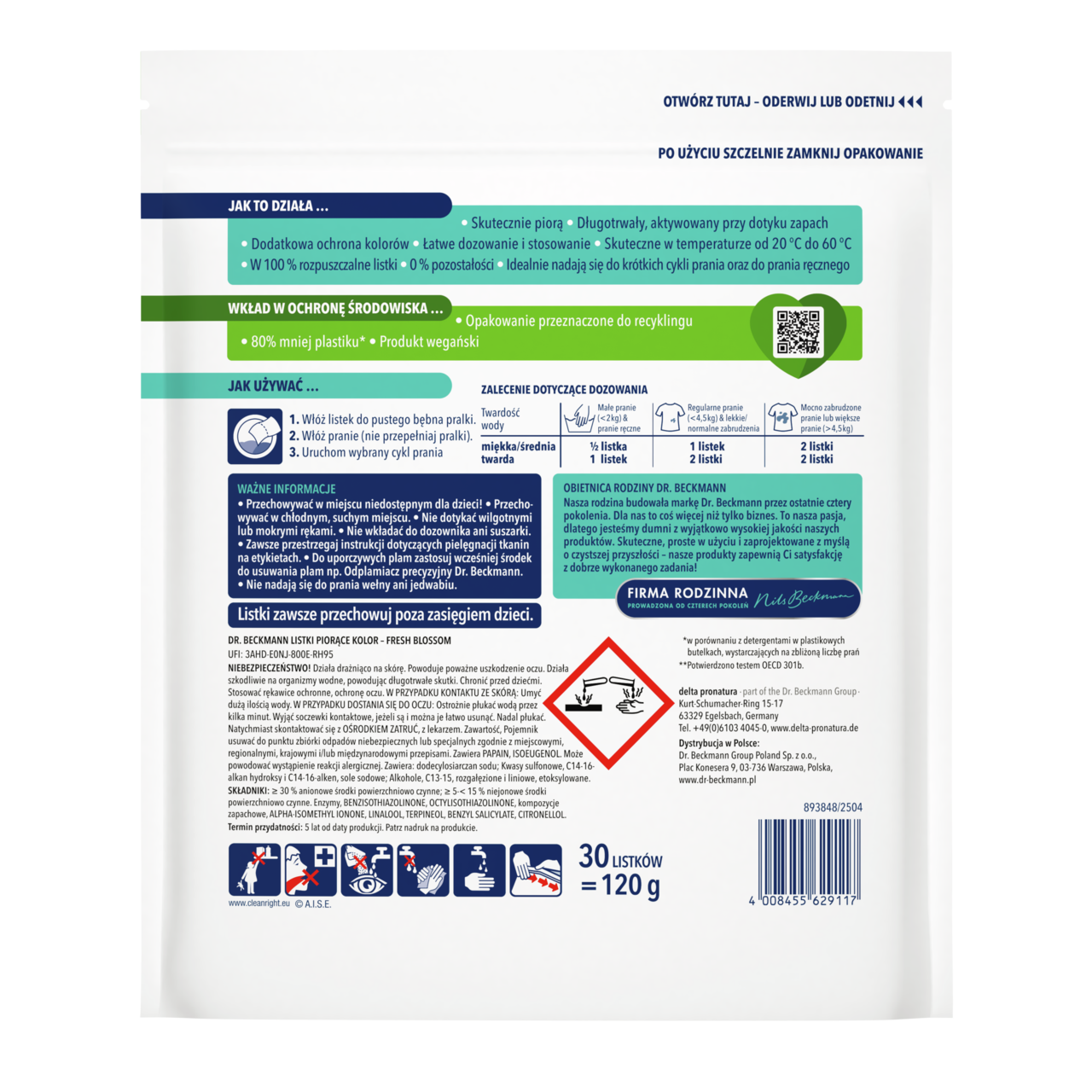 W porównaniu do konwencjonalnych płynnych detergentów do prania dostępnych w plastikowych butelkach, Dr. Beckmann zużywa o 80% mniej materiału opakowaniowego. Niestety, całkowite wyeliminowanie plastiku nie jest jeszcze możliwe. W celu ochrony listków piorących przed wilgocią do ich opakowań stosuje się plastik. Same listki rozpuszczają się w wodzie. Materiał użyty do produkcji wykonany jest z folii nadającej się do recyklingu, dzięki czemu może być ponownie wykorzystany w cyklu recyklingu. Ponadto stale pracujemy nad optymalizacją naszych opakowań.