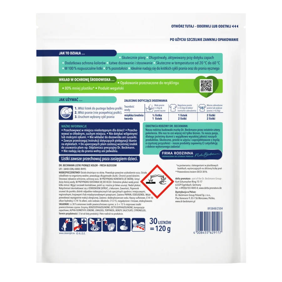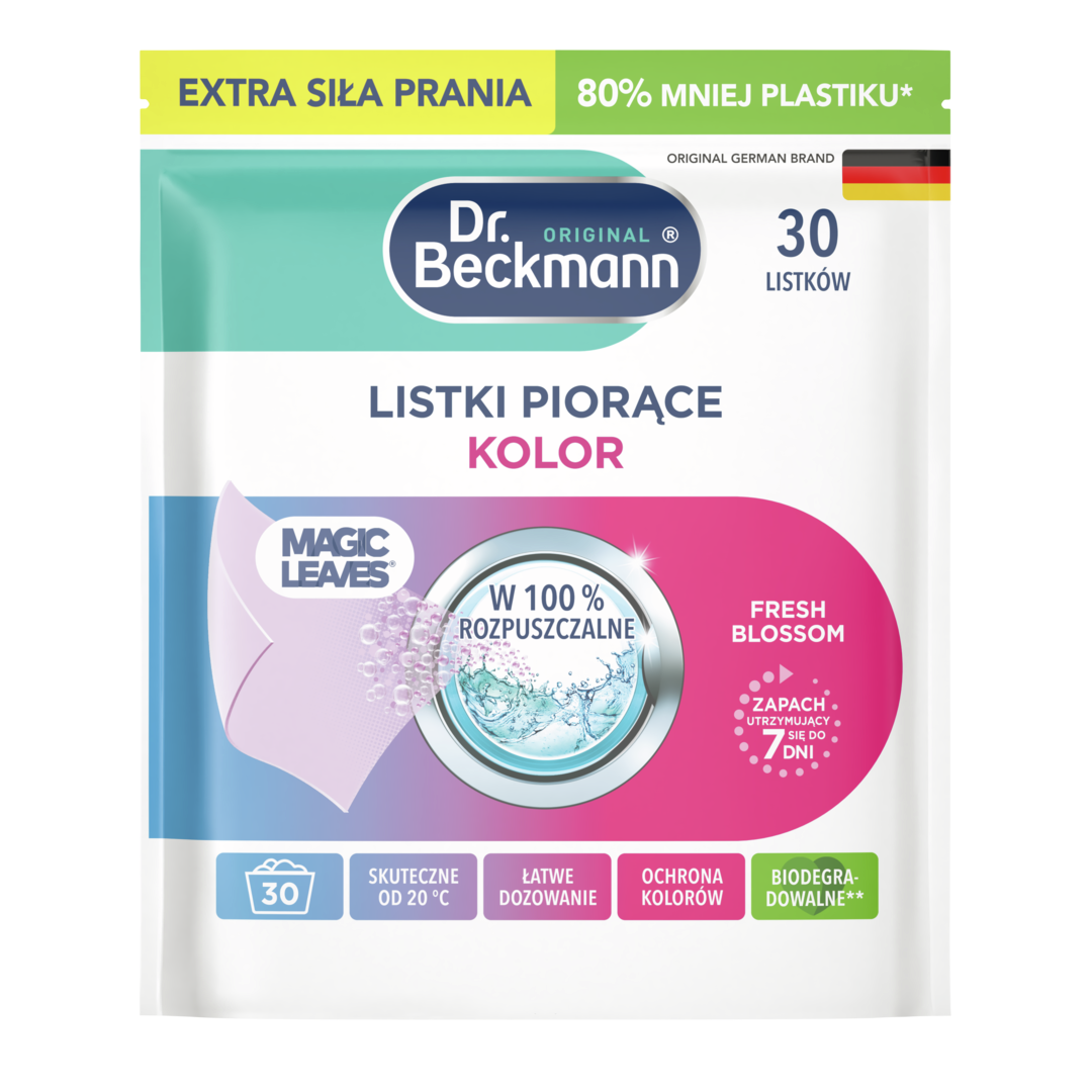 Listki piorące Dr. Beckmann rozwijają swoją moc prania już w temperaturze 20°C. W przypadku uporczywych plam zalecamy wstępne czyszczenie odplamiaczem, takim jak odplamiacz precyzyjny Dr. Beckmann lub stosowanie dodatków do prania, takich jak OXI ACTIVE sól do odplamiania Dr. Beckmann.