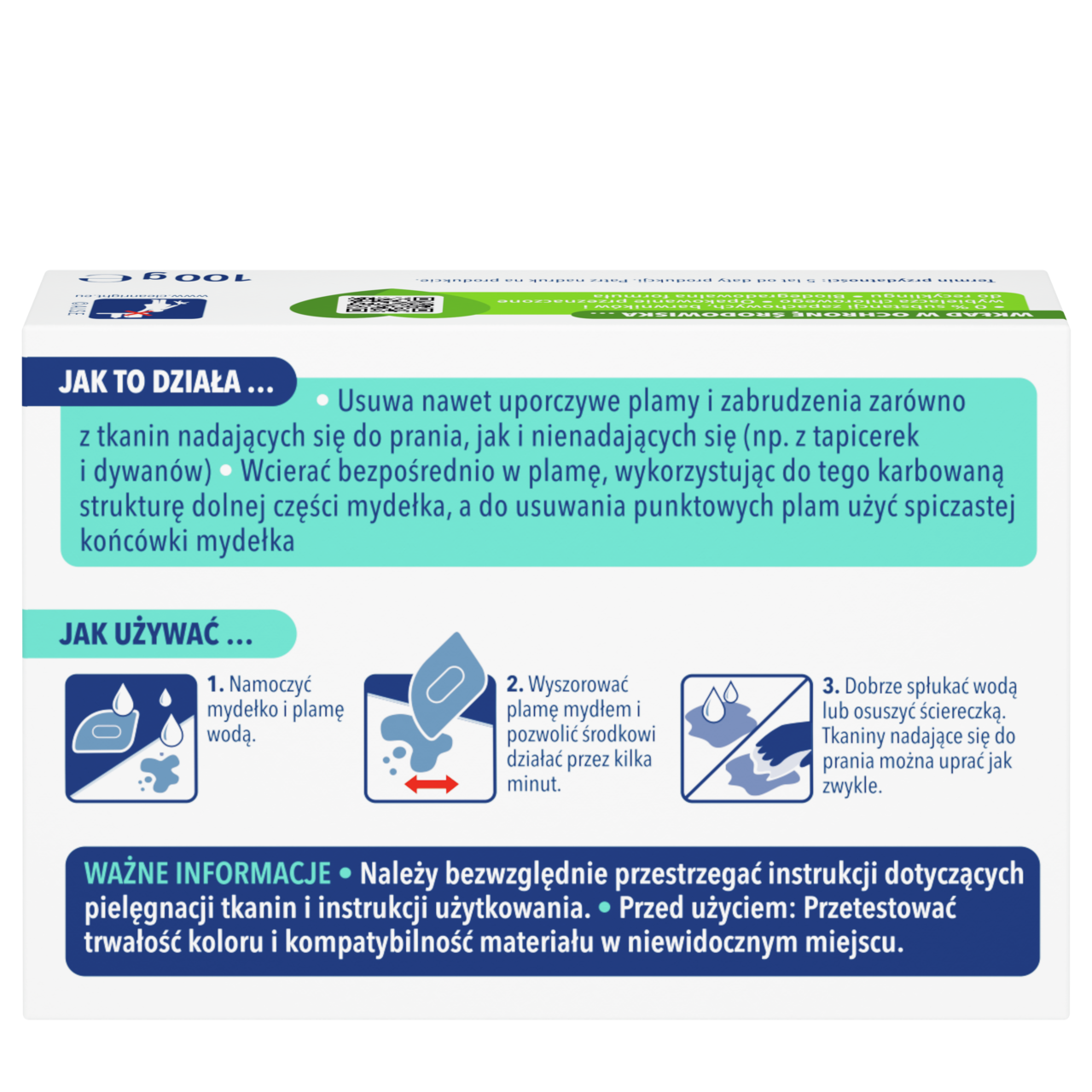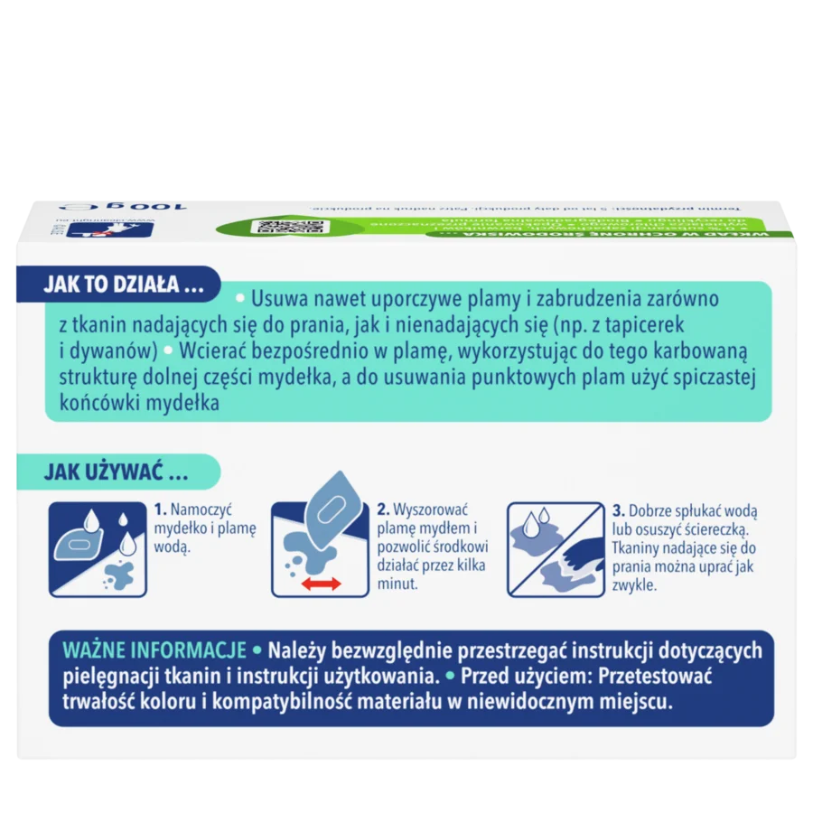 Dr. Beckmann Mydełko do odplamiania usuwa nawet uporczywe plamy i trudne zabrudzenia z tkanin nadających się do prania i niepranych (np. tapicerki i dywanów) dzięki wysoce skutecznej formule usuwającej plamy w połączeniu z działaniem mechanicznym. Przetrzyj Dr. Beckmann Mydełko do odplamiania bezpośrednio na plamie, w przypadku większych plam użyj struktury tarki na spodzie, a do punktowego usuwania plam użyj ostrych końcówek. Usuwa wiele plam, takich jak olej kuchenny/dressing sałatki makijaż, szminka, krew, brud na kołnierzykach i mankietach, tłuszcz i wiele innych.