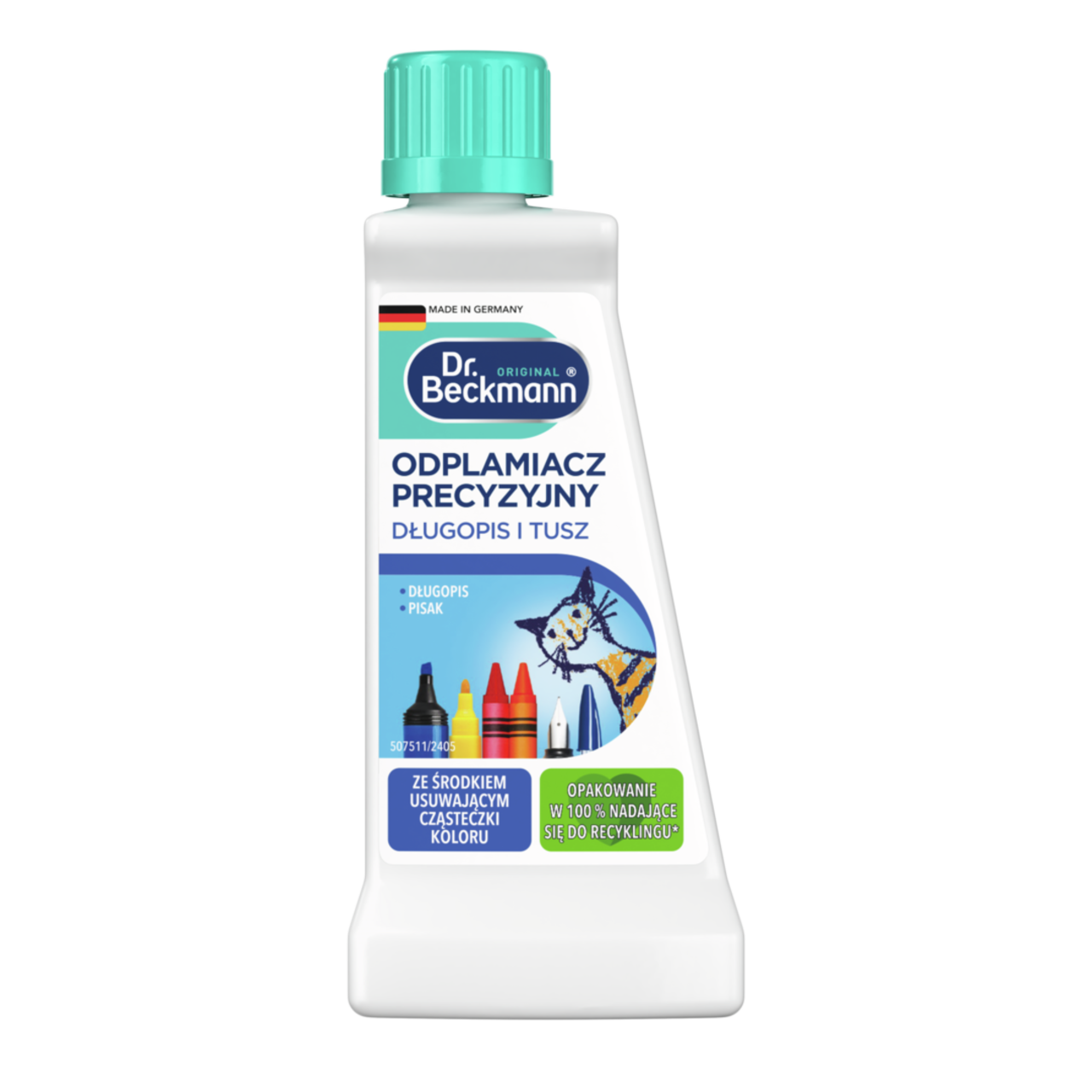 Specjalna formuła preparatu Dr. Beckmann Odplamiacz precyzyjny Długopis i tusz uwzględnia szczególne właściwości plam spowodowanych przez długopisy, inne rodzaje pisaków lub farby akwarelowe. Dzięki zastosowaniu środka do usuwania cząsteczek barwnika zawartego w płynie odplamiacza precyzyjnego, pigmenty barwiące są oddzielane i usuwane z tkaniny.