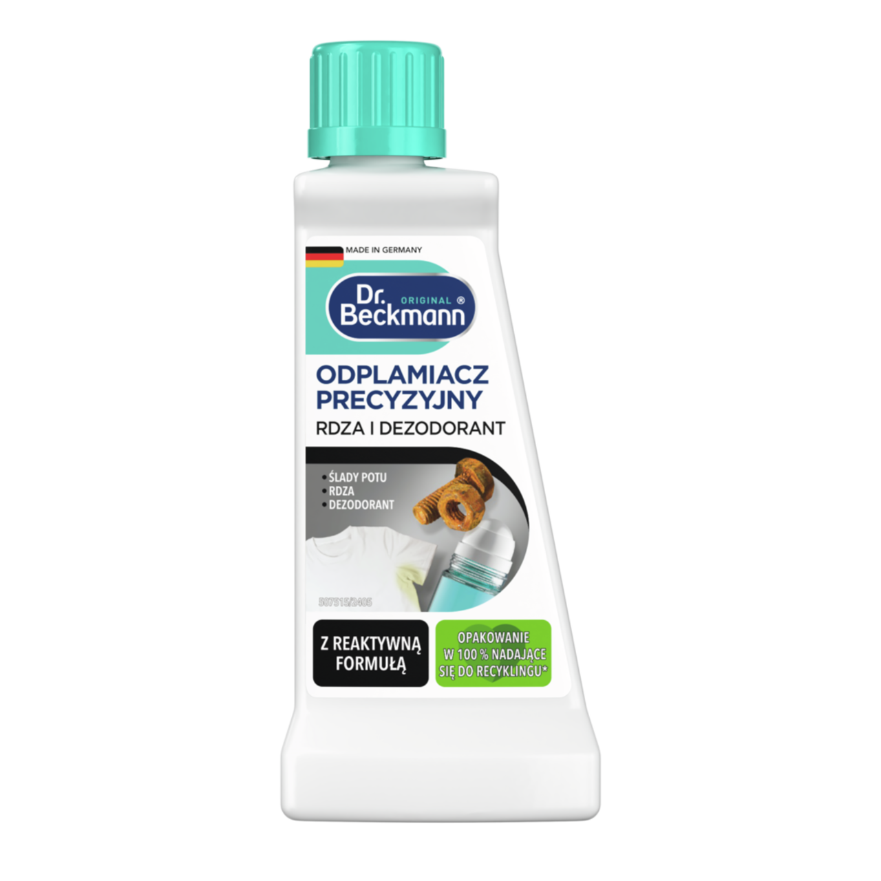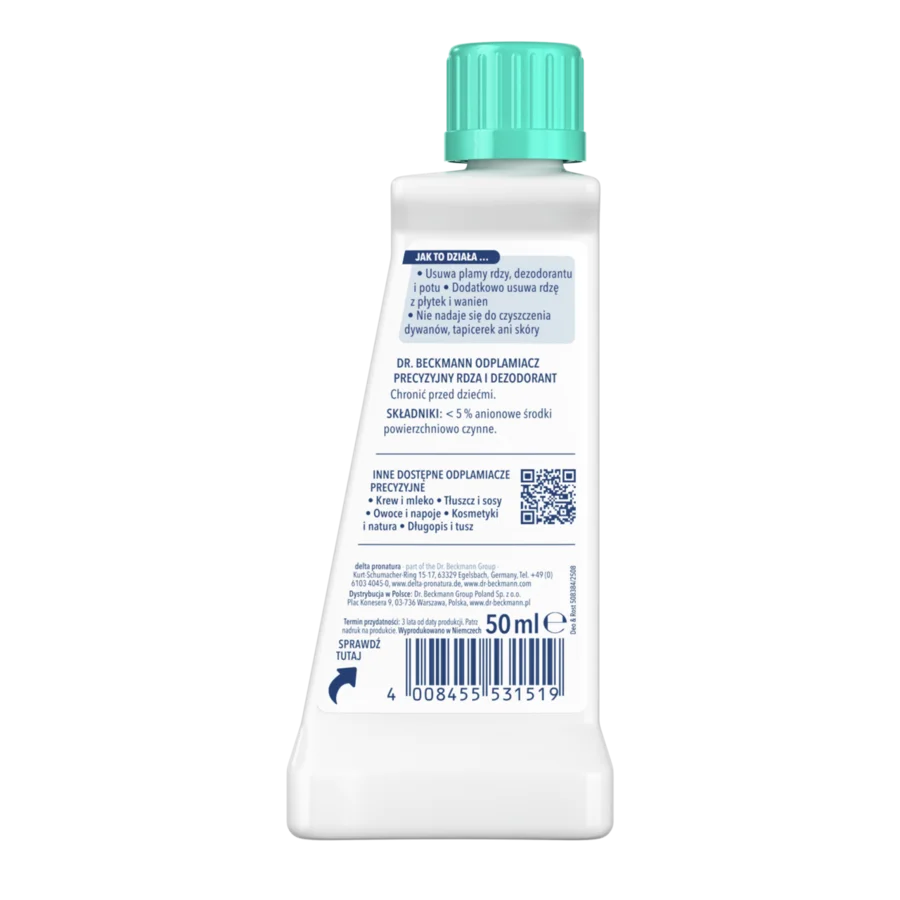 Jeżeli żelazo wejdzie w kontakt z wodą, ulegnie utlenieniu i zacznie rdzewieć. Dr. Beckmann Odplamiacz precyzyjny Rdza i dezodorant usuwa plamy z rdzy i dezodorantu dzięki specjalnie opracowanej formule reaktywnej, która neutralizuje utlenianie i w ten sposób usuwa plamę.