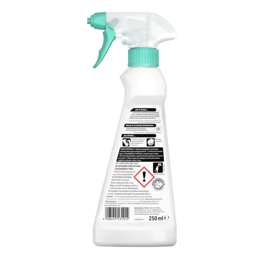 Spray do plam z dezodorantu i potu Dr. Beckmann zawiera aktywny tlen, który wnika głęboko we włókna tkaniny, usuwając uporczywe plamy i zapachy.
