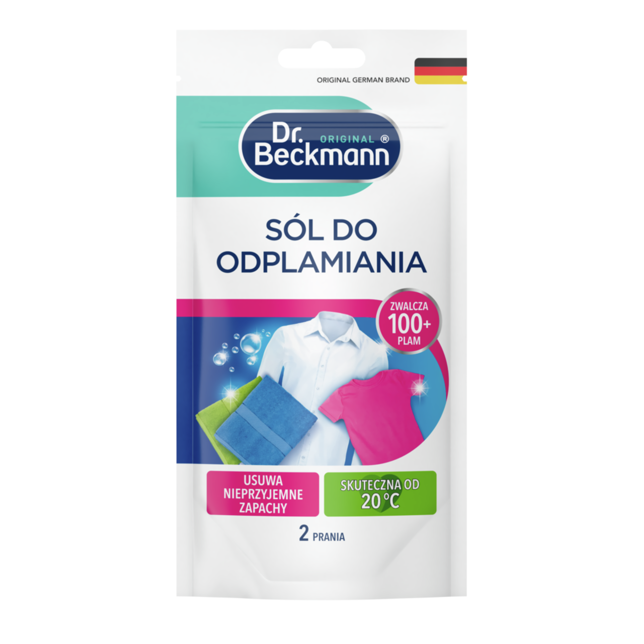 Dr. Beckmann Sól do odplamiania usuwa uporczywe, a nawet zaschnięte plamy. Silna formuła z aktywnym tlenem usuwa każdy rodzaj plam, w tym plamy zdatne do wybielenia (np. z kawy, herbaty, czerwonego wina, owoców), kolorowe, na bazie tłuszczu i białka (np. z krwi, lodów) – nawet w niskich temperaturach od 20°C.