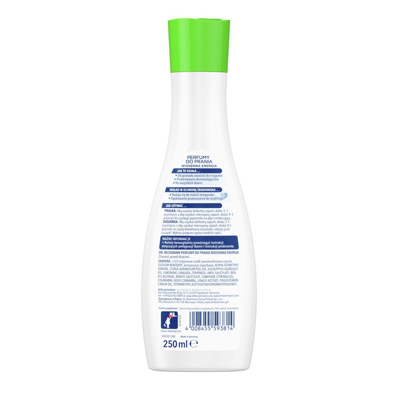 Nowe perfumy do prania Dr. Beckmann otulają Twoje tkaniny urzekającą, długotrwałą świeżością, która utrzymuje się nawet do 6 tygodni. Dzięki technologii zamkniętych w kapsułkach zapachów, te zachwycające aromaty przenikają Twoje ubrania po każdym praniu, a dodatkowo uwalniają się za każdym razem, gdy ich dotykasz, na przykład wyjmując je z szafy lub nosząc je w ciągu dnia. Perfumy do prania Dr. Beckmann zostały przetestowane dermatologicznie i są delikatne dla tkanin, nawet tych delikatnych i syntetycznych. Płyny są łatwe w użyciu i nadają się do prania w zimnej wodzie oraz krótkich cykli prania, nie pozostawiając żadnych śladów.