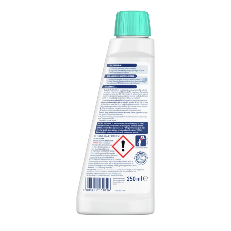 Osady kamienia nie tylko wyglądają nieestetycznie, ale mogą również prowadzić do pogorszenia wydajności urządzenia i większego zużycia energii. Formuła preparatu Dr. Beckmann Srodek do odkamieniania wykazała lepszą skuteczność w usuwaniu kamienia niż kwas cytrynowy, zapewniając szybkie i skuteczne odkamienianie. Dzięki temu można odkamienić nie tylko czajniki, ale także np. ekspresy do kawy kapsułkowe i zabezpieczyć je przed awariami. Regularne stosowanie produktu zapobiega awariom i obniżonej wydajności urządzenia.