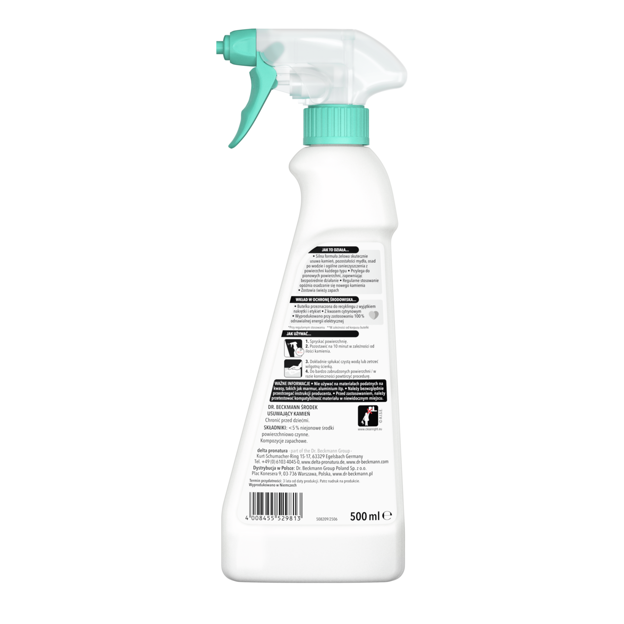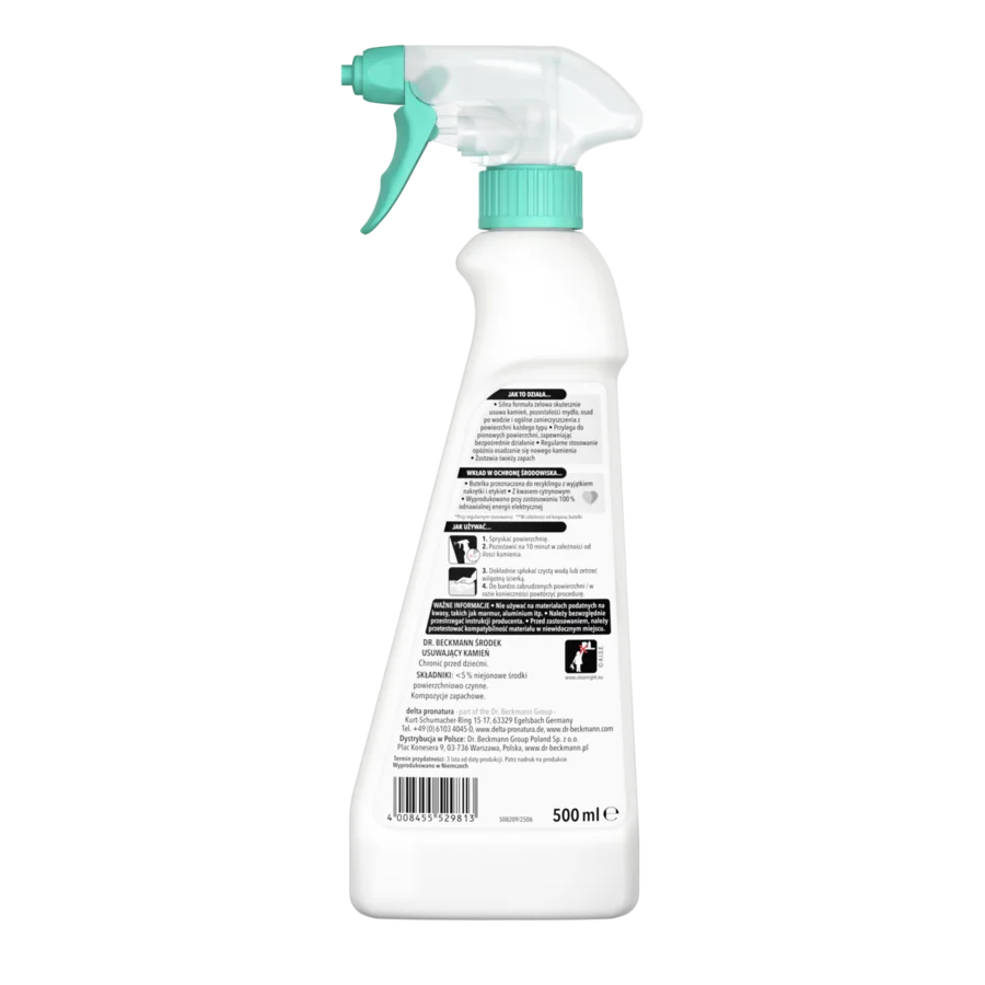 Dr. Beckmann Srodek usuwajacy kamien to łatwy w użyciu żel w sprayu, który skutecznie zwalcza i usuwa osady wapienne, pozostałości mydła, ślady po wodzie i ogólne zabrudzenia z wszelkiego rodzaju powierzchni. Po rozpyleniu przylega do powierzchni, dzięki czemu może skutecznie działać w najbardziej wymagających tego miejscach. Regularne stosowanie środka opóźnia tworzenie się nowego kamienia. Nadaje się do stosowania na wszystkich metalach, w tym na stali nierdzewnej, miedzi i mosiądzu.
