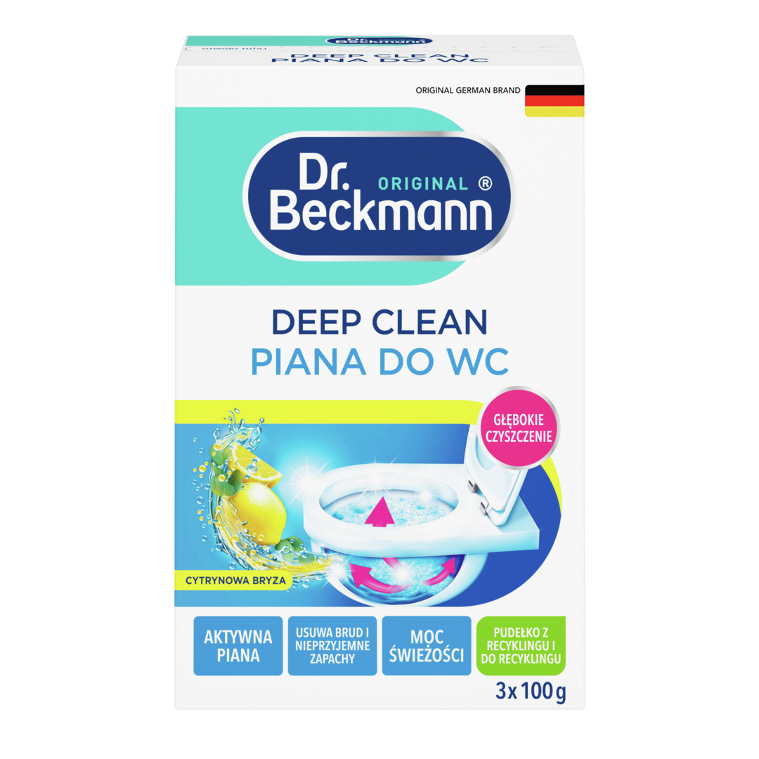 Dr. Beckmann Deep clean piana do wc dokładnie i łatwo czyści muszlę klozetową. Zaawansowana formuła z kwasem cytrynowym skutecznie usuwa trudne zabrudzenia oraz nieprzyjemne zapachy, a regularne używanie zapobiega osadzaniu się kamienia i osadów z moczu. W kontakcie z wodą proszek zamienia się w niebieską pianę, która skutecznie usuwa zabrudzenia. Lśniąca czystość toalety ze świeżym zapachem cytryny i eukaliptusa, stworzonym z naturalnych olejków eterycznych.