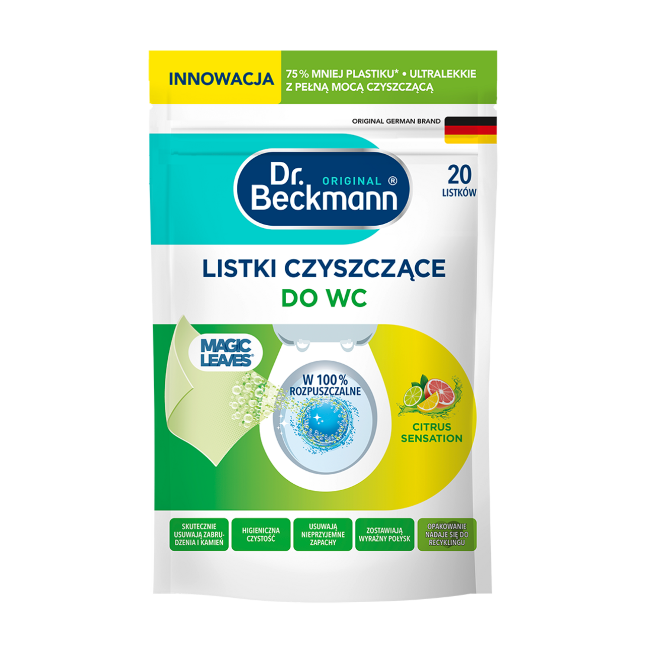 W porównaniu z konwencjonalnymi środkami do czyszczenia toalet w plastikowych butelkach (przy porównywalnej ilości aplikacji na jednostkę opakowania), Dr. Beckmann Listki Czyszczące Do WC zużywa o 83% mniej materiału opakowaniowego. Niestety, nie jest jeszcze możliwe całkowite uniknięcie plastiku, ponieważ produkt jest rozpuszczalny w wodzie i wymaga maksymalnej ochrony przed wilgocią zewnętrzną. Dlatego ważne jest, aby używać zamykanego opakowania, które jest zarówno wodoodporne, jak i hermetyczne, aby zmaksymalizować okres przydatności do spożycia i skuteczność. W przypadku tego typu produktów najlepszym rozwiązaniem jest zazwyczaj plastikowa saszetka - wypróbowane i przetestowane rozwiązanie opakowaniowe w sektorze detergentów i środków czyszczących. Woreczki stojące nadają się do recyklingu, dzięki czemu można je ponownie wykorzystać w cyklu recyklingu. Ponadto stale pracujemy nad optymalizacją opakowań.