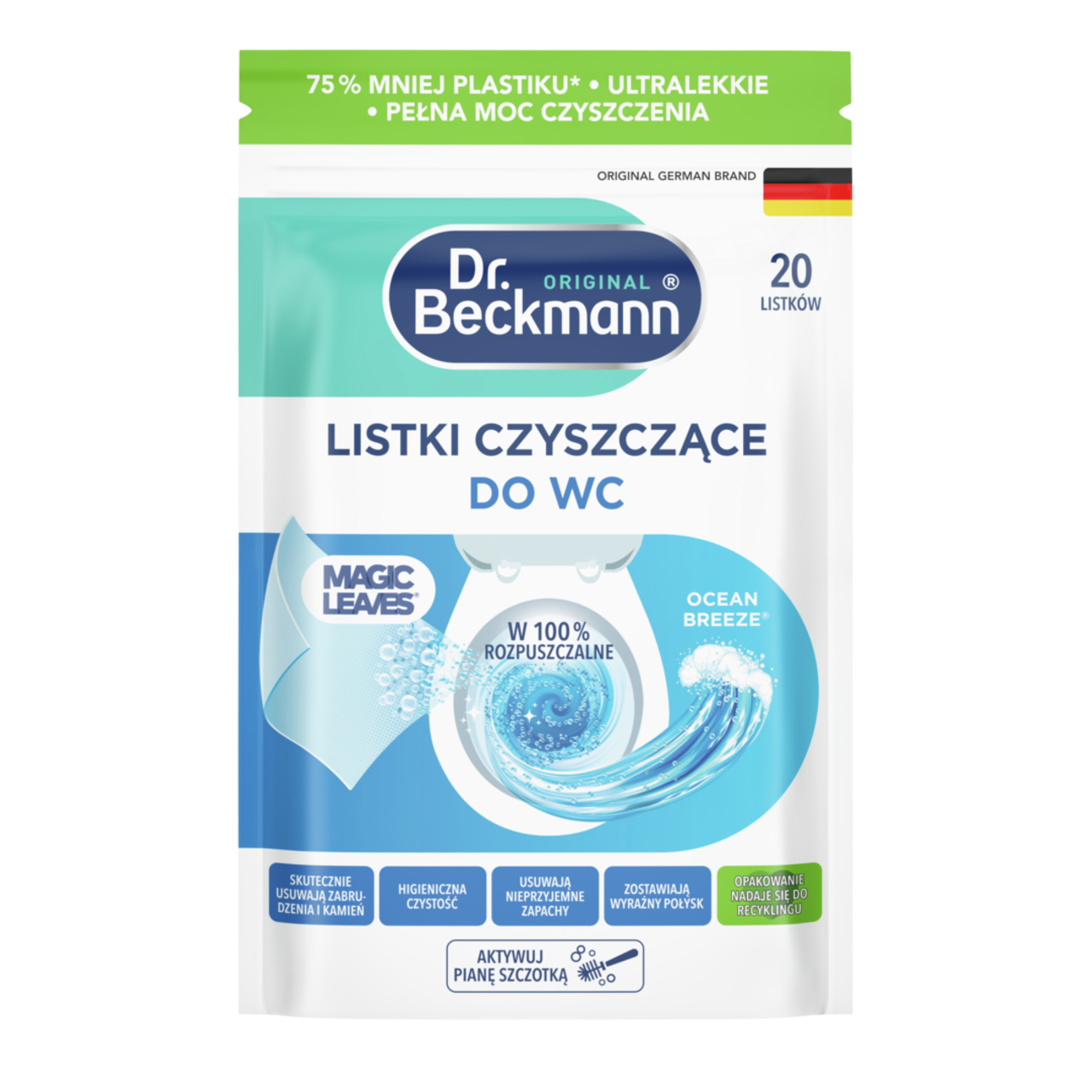 W porównaniu z konwencjonalnymi środkami do czyszczenia toalet w plastikowych butelkach (przy porównywalnej ilości aplikacji na jednostkę opakowania), Dr. Beckmann Listki Czyszczące Do WC zużywa o 83% mniej materiału opakowaniowego. Niestety, nie jest jeszcze możliwe całkowite uniknięcie plastiku, ponieważ produkt jest rozpuszczalny w wodzie i wymaga maksymalnej ochrony przed wilgocią zewnętrzną. Dlatego ważne jest, aby używać zamykanego opakowania, które jest zarówno wodoodporne, jak i hermetyczne, aby zmaksymalizować okres przydatności do spożycia i skuteczność. W przypadku tego typu produktów najlepszym rozwiązaniem jest zazwyczaj plastikowa saszetka - wypróbowane i przetestowane rozwiązanie opakowaniowe w sektorze detergentów i środków czyszczących. Woreczki stojące nadają się do recyklingu, dzięki czemu można je ponownie wykorzystać w cyklu recyklingu. Ponadto stale pracujemy nad optymalizacją opakowań.