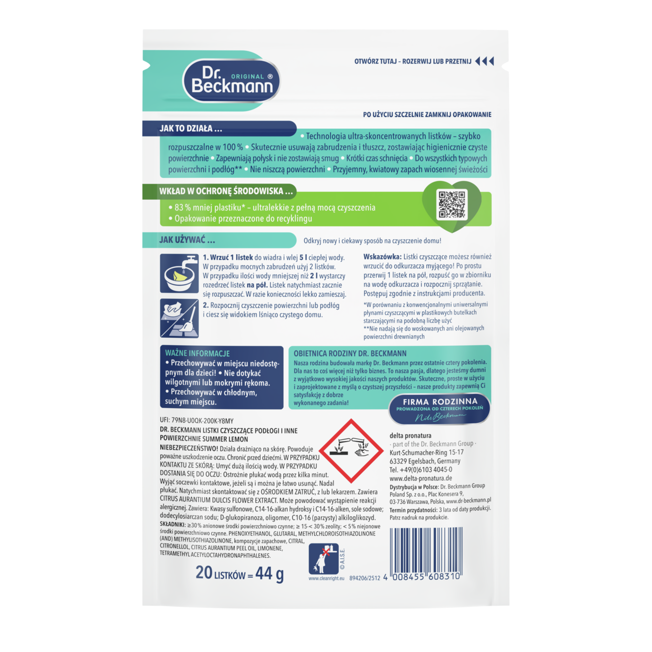 W porównaniu z konwencjonalnymi uniwersalnymi środkami czyszczącymi w plastikowych butelkach (przy porównywalnej ilości aplikacji na jednostkę opakowania), Dr. Beckmann Uniwersalne Listki Czyszczące zużywa o 83% mniej materiału opakowaniowego. Niestety, nie jest jeszcze możliwe całkowite uniknięcie plastiku, ponieważ produkt jest rozpuszczalny w wodzie i wymaga maksymalnej ochrony przed wilgocią zewnętrzną. Dlatego ważne jest, aby używać zamykanego opakowania, które jest zarówno wodoodporne, jak i hermetyczne, aby zmaksymalizować okres przydatności do spożycia i skuteczność. W przypadku tego typu produktów najlepszym rozwiązaniem jest zazwyczaj plastikowa torebka - sprawdzone i przetestowane rozwiązanie opakowaniowe w sektorze detergentów i środków czyszczących. Woreczki stojące nadają się do recyklingu, dzięki czemu można je ponownie wykorzystać w cyklu recyklingu. Ponadto stale pracujemy nad optymalizacją opakowań.