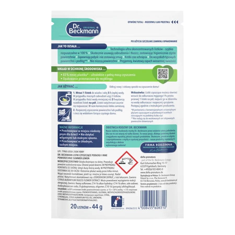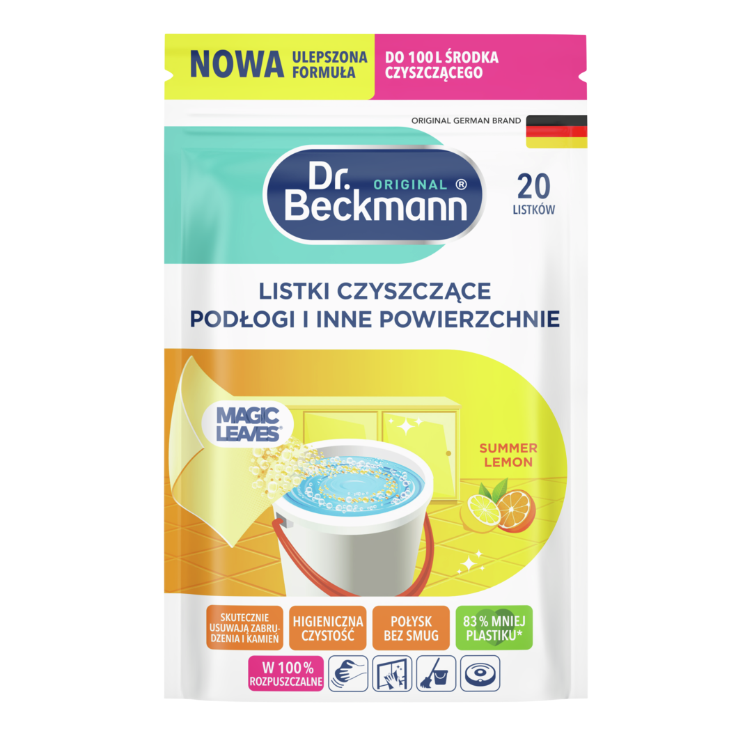 Uniwersalne listki czyszczące Dr. Beckmann zrewolucjonizują sprzątanie domu: Ultralekkie listki są w 100% rozpuszczalne i skutecznie chronią przed brudem i tłuszczem. Po prostu wrzuć je do wiadra z wodą i zacznij mopować! Listki nadają się do stosowania na wszystkich powszechnie spotykanych powierzchniach i podłogach** i pozostawiają świeży zapach letniej cytryny. Dzięki swemu kompaktowemu formatowi uniwersalne listki czyszczące są łatwe do przenoszenia i przechowywania, a w ich opakowaniu znajduje się o 83% mniej plastiku*. Odkryj nasze nowe uniwersalne listki czyszczące, dzięki którym Twój dom będzie lśnił czystością i higieną!