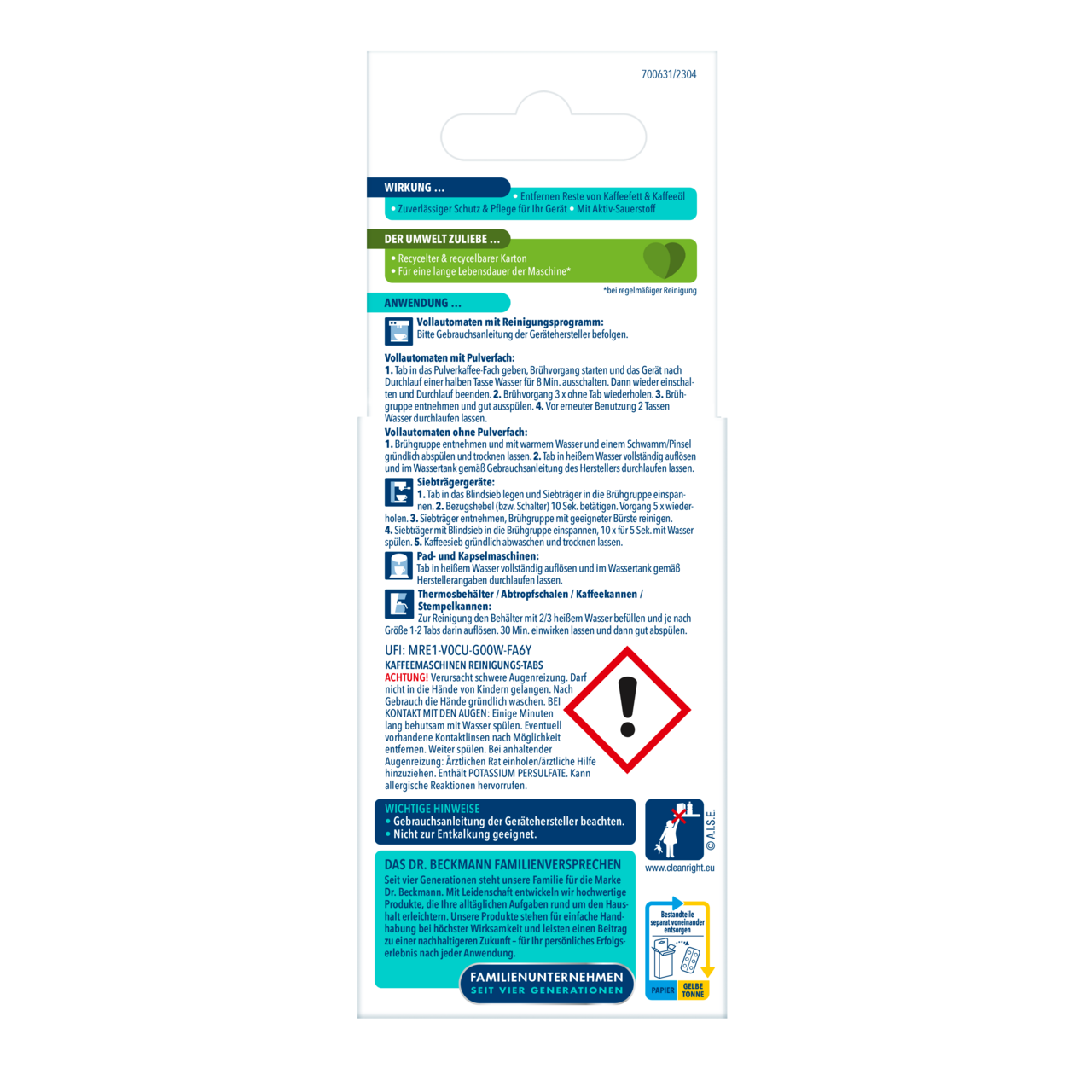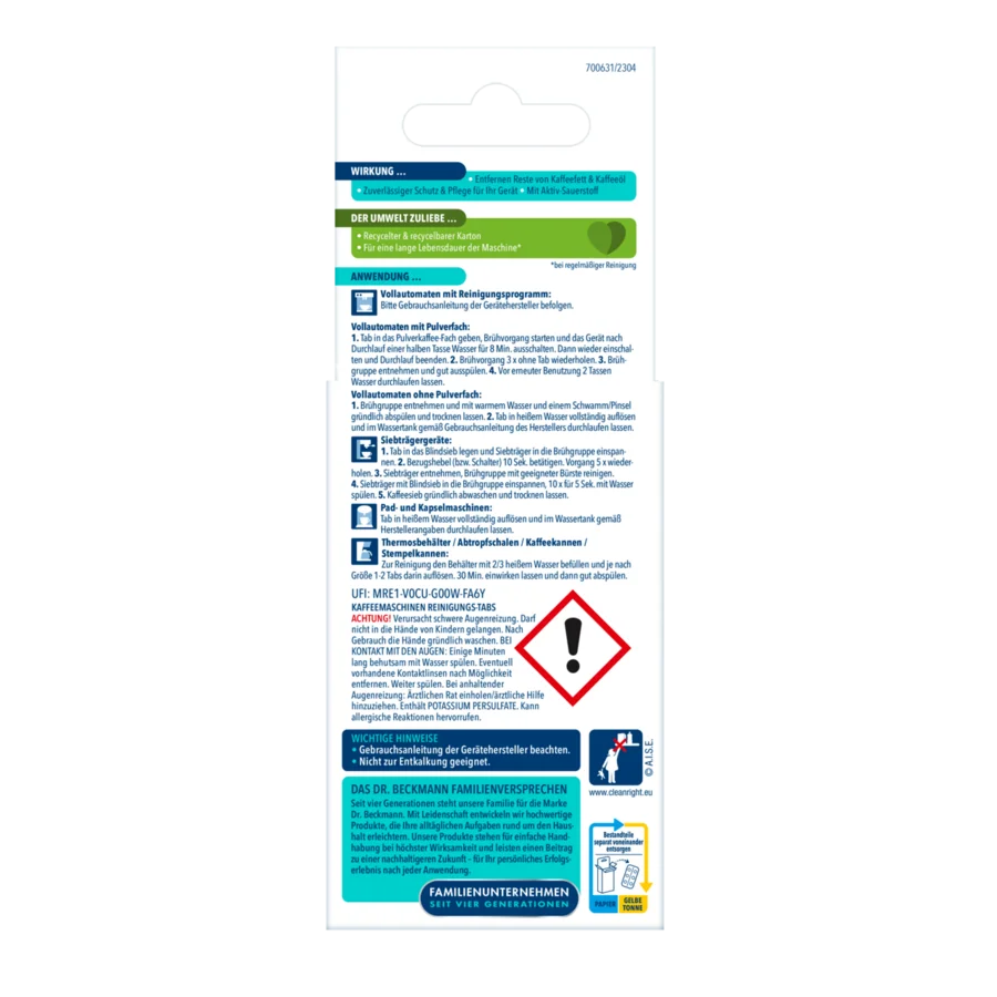 Este important să curățați aparatul de cafea în mod regulat, pentru a vă bucura de o cafea perfectă și pentru a asigura o durată lungă de viață a acestuia. Acest lucru se datorează faptului că de fiecare dată când se utilizează aparatul de cafea, se depun grăsimi și uleiuri de cafea, care pot afecta funcționarea dispozitivului. Tabletele de curățare pentru aparate de cafea Dr. Beckmann îndepărtează orice reziduuri de grăsime a cafelei și protejează fiabil aparatul în acest proces.