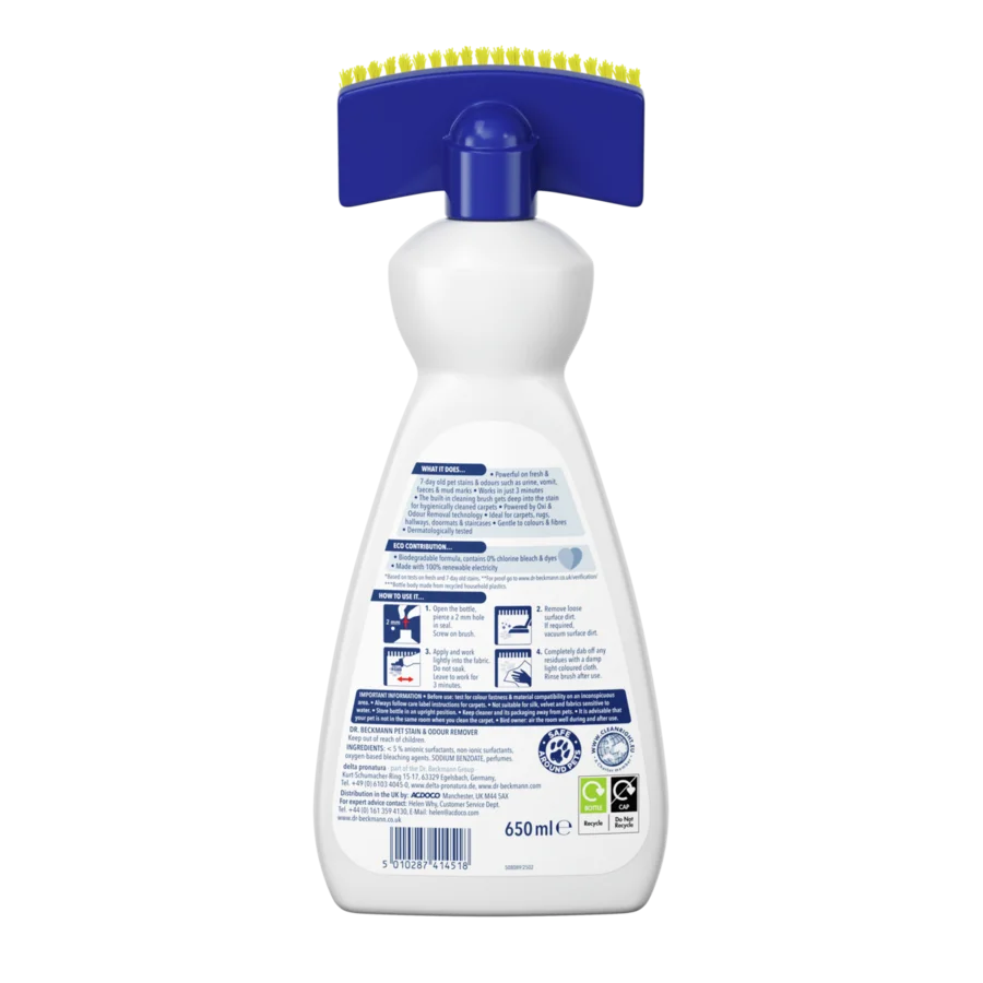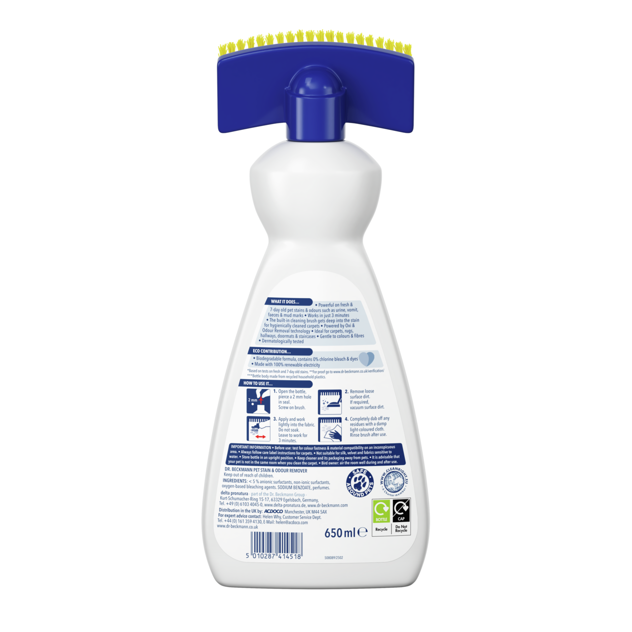 Dr. Beckmann Pet Stain & Odour Remover este soluția noastră ultra-puternică când vine de petele noi și vechi făcute de animalele de companie. În doar trei minute, această soluție de curățare puternică are grijă de acele sarcini inestetice, gestionând fără efort mirosurile de urină, vomă, fecale și lăbuțe pline de noroi, asigurând în același timp un mediu igienic curat. În plus, este sigur pentru animalele dvs. de companie iubite. Datorită combinației dintre peria de curățare încorporată și tehnologia oxi și a tehnologiei avansate de îndepărtare a mirosurilor, acesta poate pătrunde adânc în pete, lăsând covoarele să arate și să miroasă proaspăt și curat, descurajând animalele de companie să le murdărească din nou. Puteți avea încredere că peria cu textură dublă, cu burete și peri, este delicată cu textilele dvs. prețioase, păstrându-le culorile și fibrele, deci este alegerea ideală pentru covoare, carpete, holuri, preșuri și scări. În plus, a fost testat dermatologic pentru liniștea dumneavoastră, asigurându-vă că este sigur de utilizat. Rezultatul? Pe scurt, suprafețele dvs. vor arăta ca și cum ar fi noi, indiferent de murdăria pe care au suportat-o, iar dvs. vă puteți petrece mai mult timp iubindu-vă prietenii blănoși.