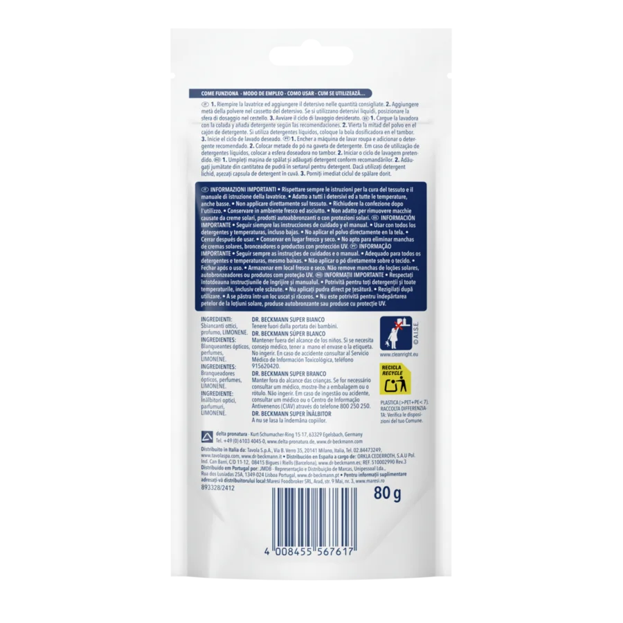 Pudra Dr. Beckmann Super White menține strălucirea albului, fără a afecta fibrele sau materialele textile. Ideal pentru a fi utilizat la fiecare spălare pentru a vă bucura de un alb strălucitor. Funcționează pentru toate materialele textile, ciclurile și temperaturile, chiar și la temperaturi scăzute de 20 °C.Nu este ideal pentru