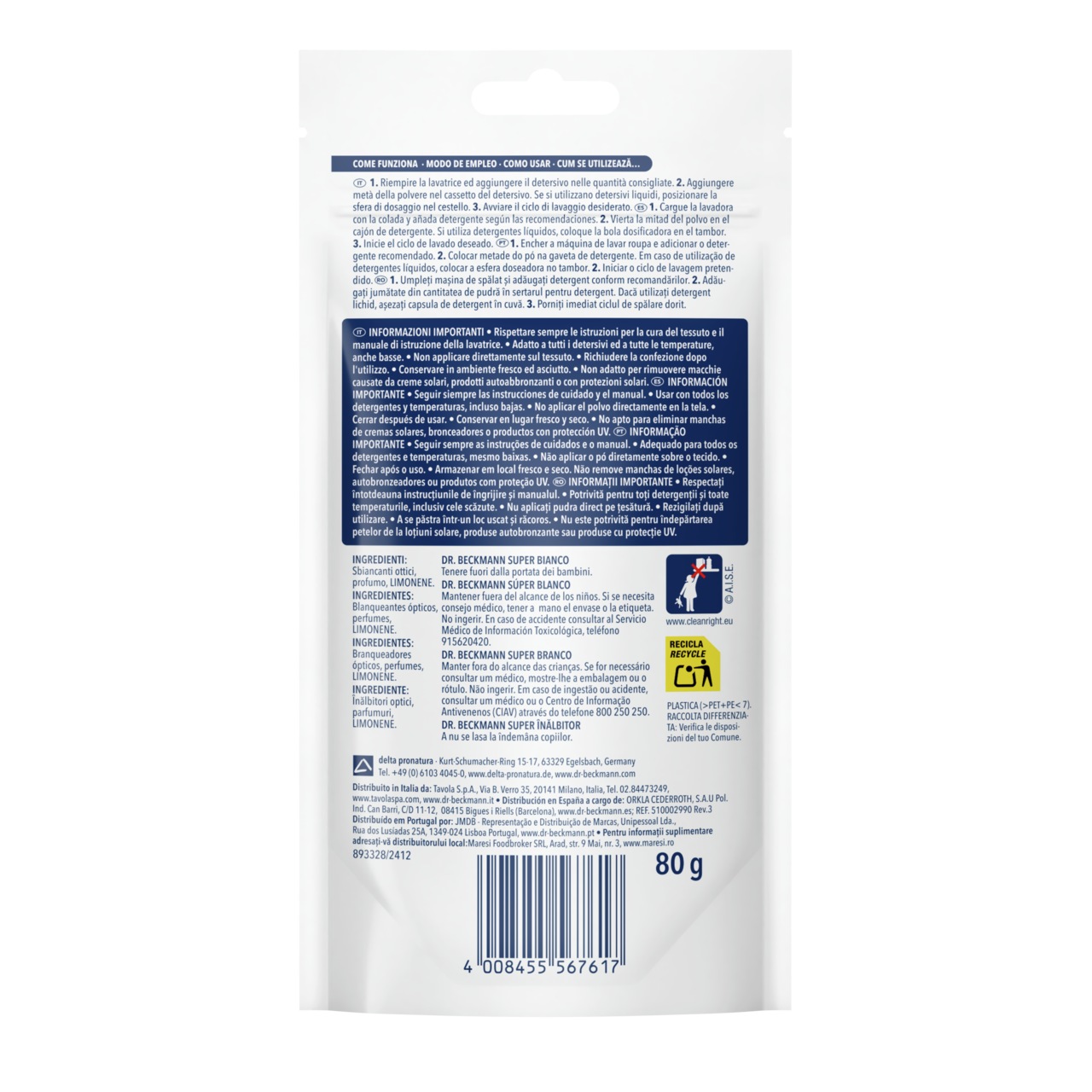 Pudra Dr. Beckmann Super White menține strălucirea albului, fără a afecta fibrele sau materialele textile. Ideal pentru a fi utilizat la fiecare spălare pentru a vă bucura de un alb strălucitor. Funcționează pentru toate materialele textile, ciclurile și temperaturile, chiar și la temperaturi scăzute de 20 °C.Nu este ideal pentru