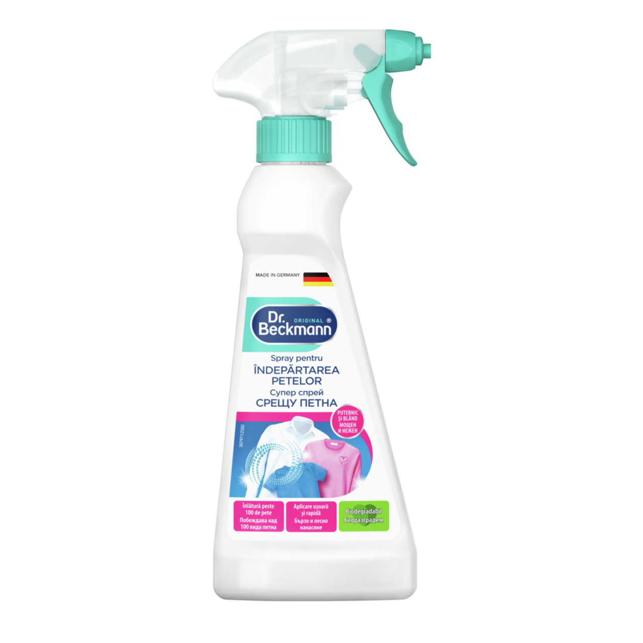 Dr. Beckmann PreWash Stain Spray îndepărtează rapid și eficient diverse pete și urme de murdărie. Îndepărtează peste 100 de pete diferite, cum ar fi petele colorate, cele care pot fi decolorate (de ex. cafea, ceai, vin roșu, fructe) și petele de grăsime. Este potrivit chiar și pentru materiale textile delicate. Chiar și petele de pe lână și mătase sunt îndepărtate complet.Ideal pentru
